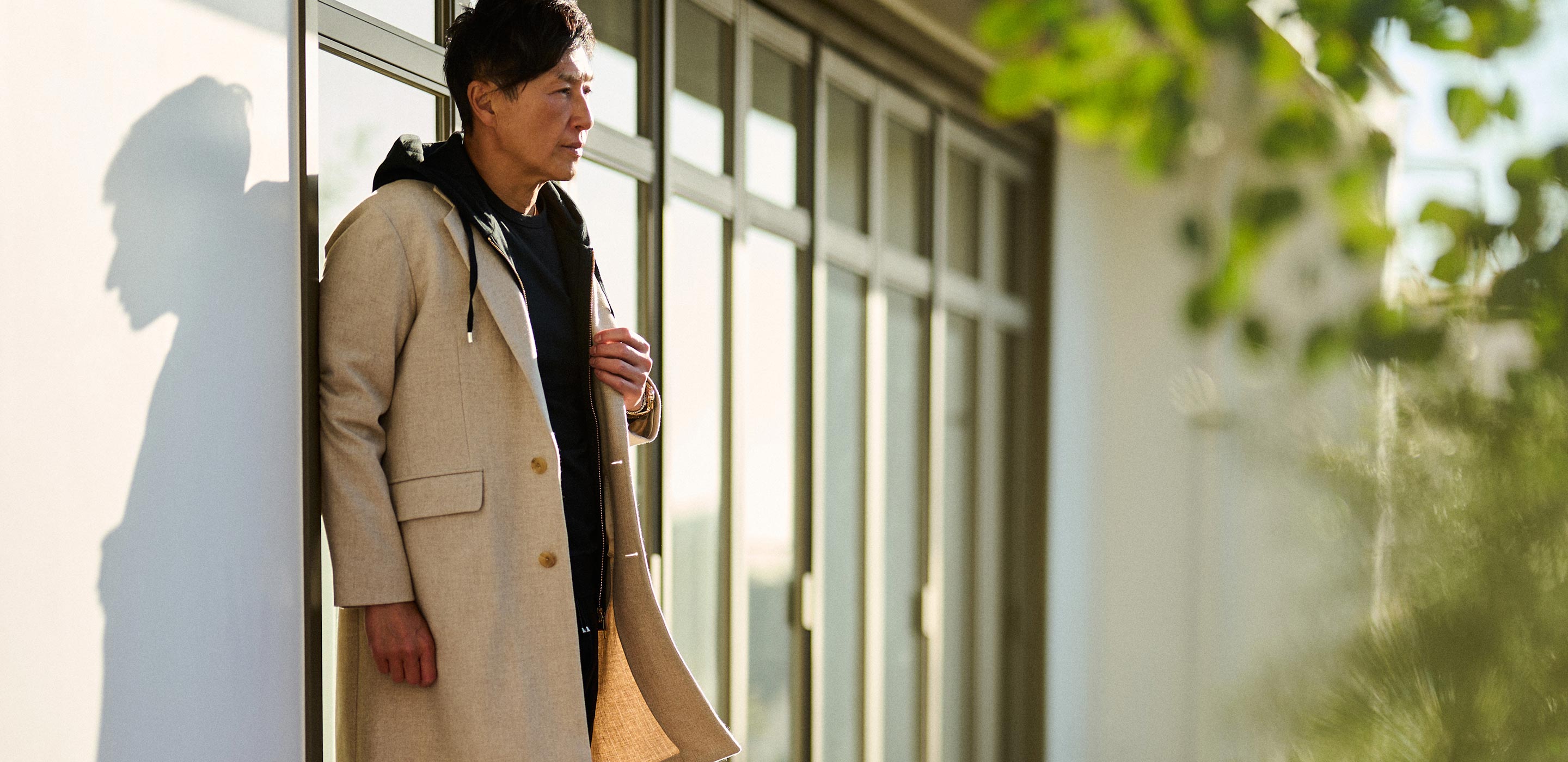 パーカーにリブパンのカジュアルな戸賀さんが、バサっと羽織ったコートは、B.R.SHOPオリジナルのチェスターコートです。今風のシルエットに、着回し力を考慮した着…