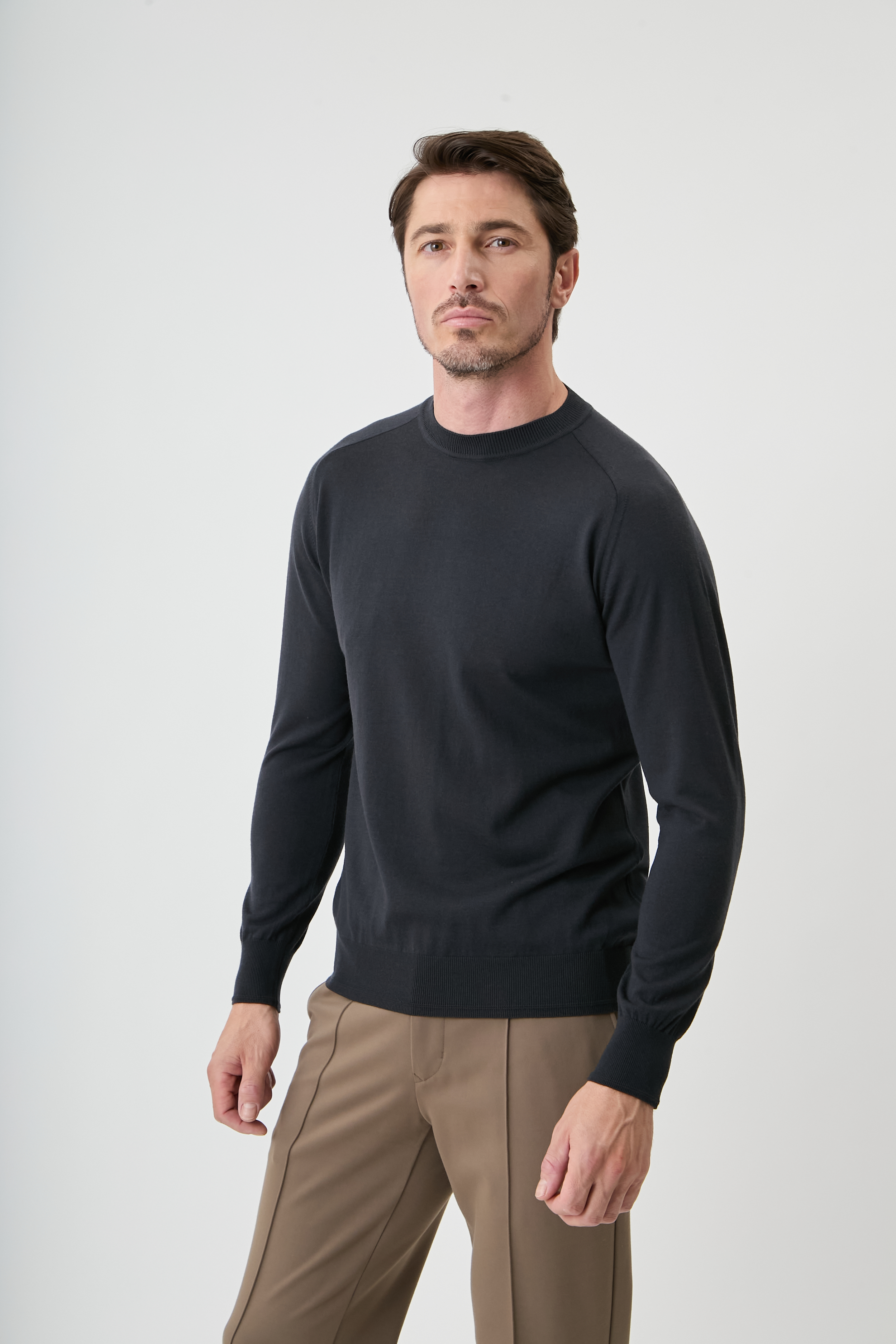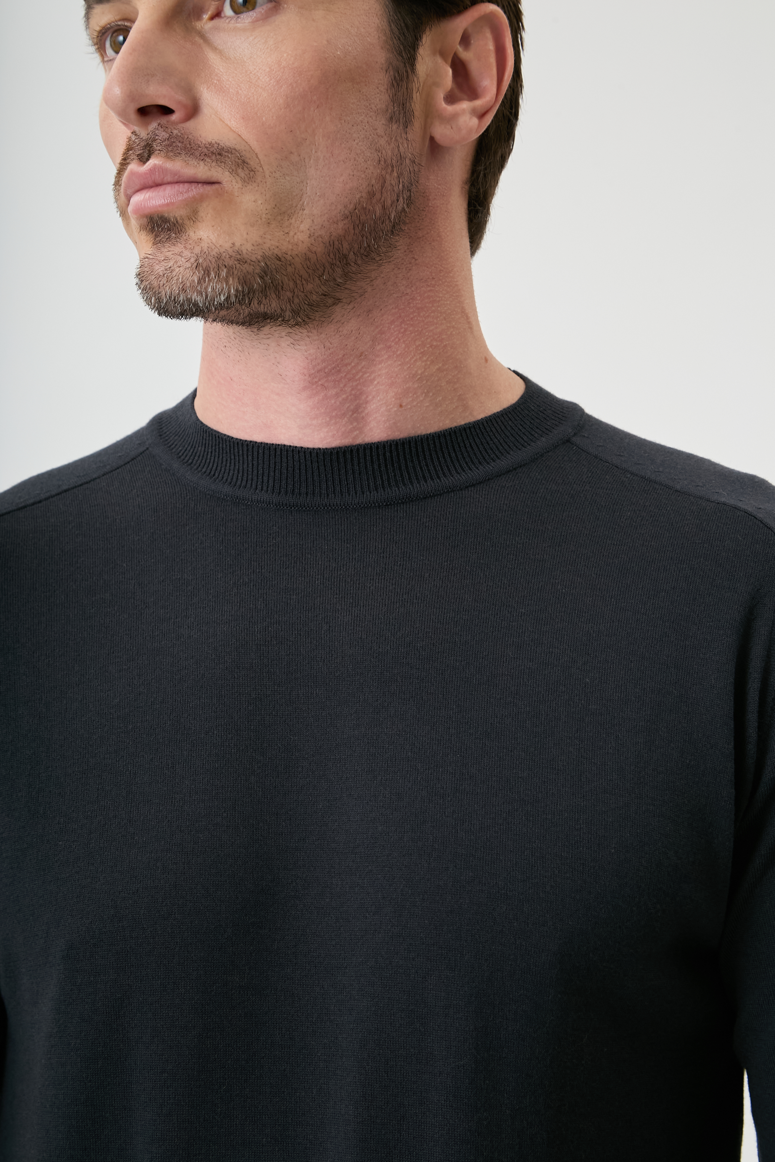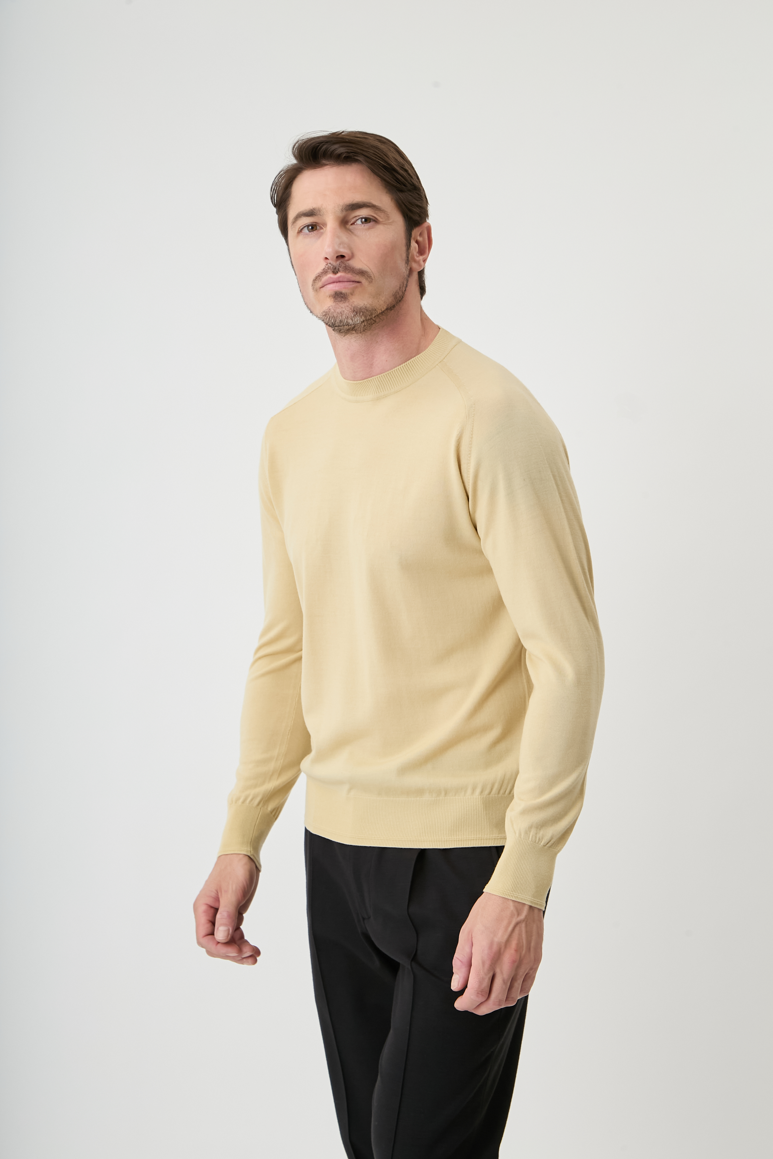 上質なウールならではの光沢と発色を活かした、ハイゲージクルーネックニット。