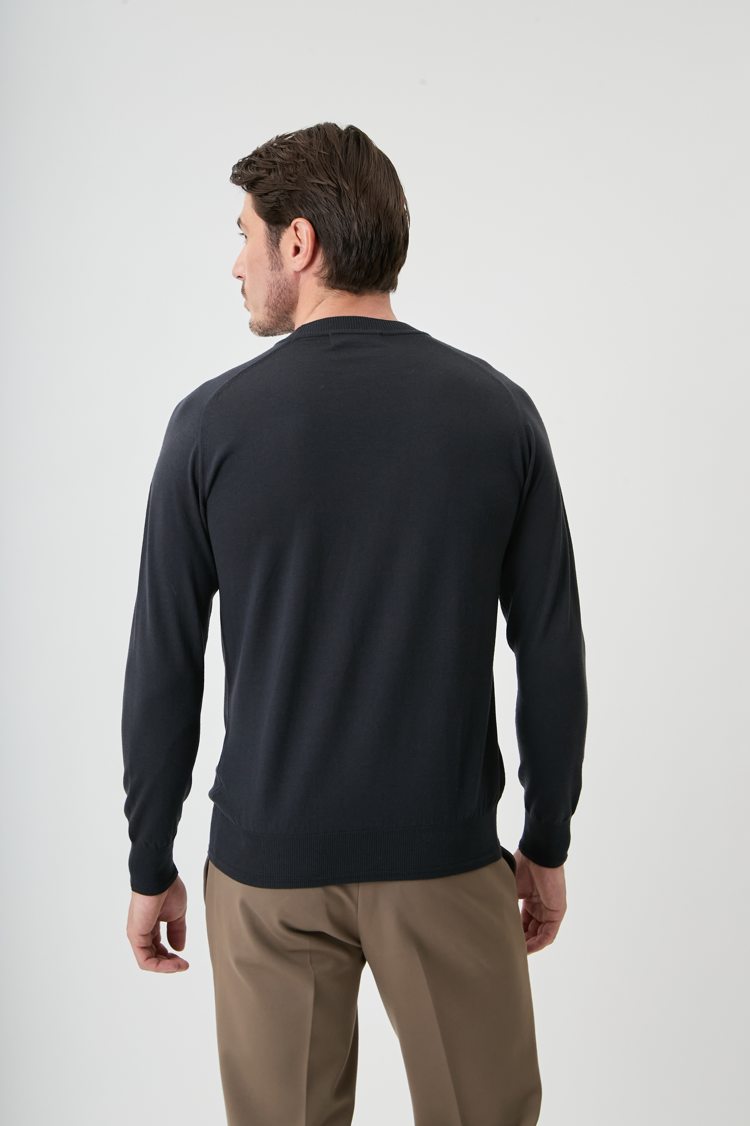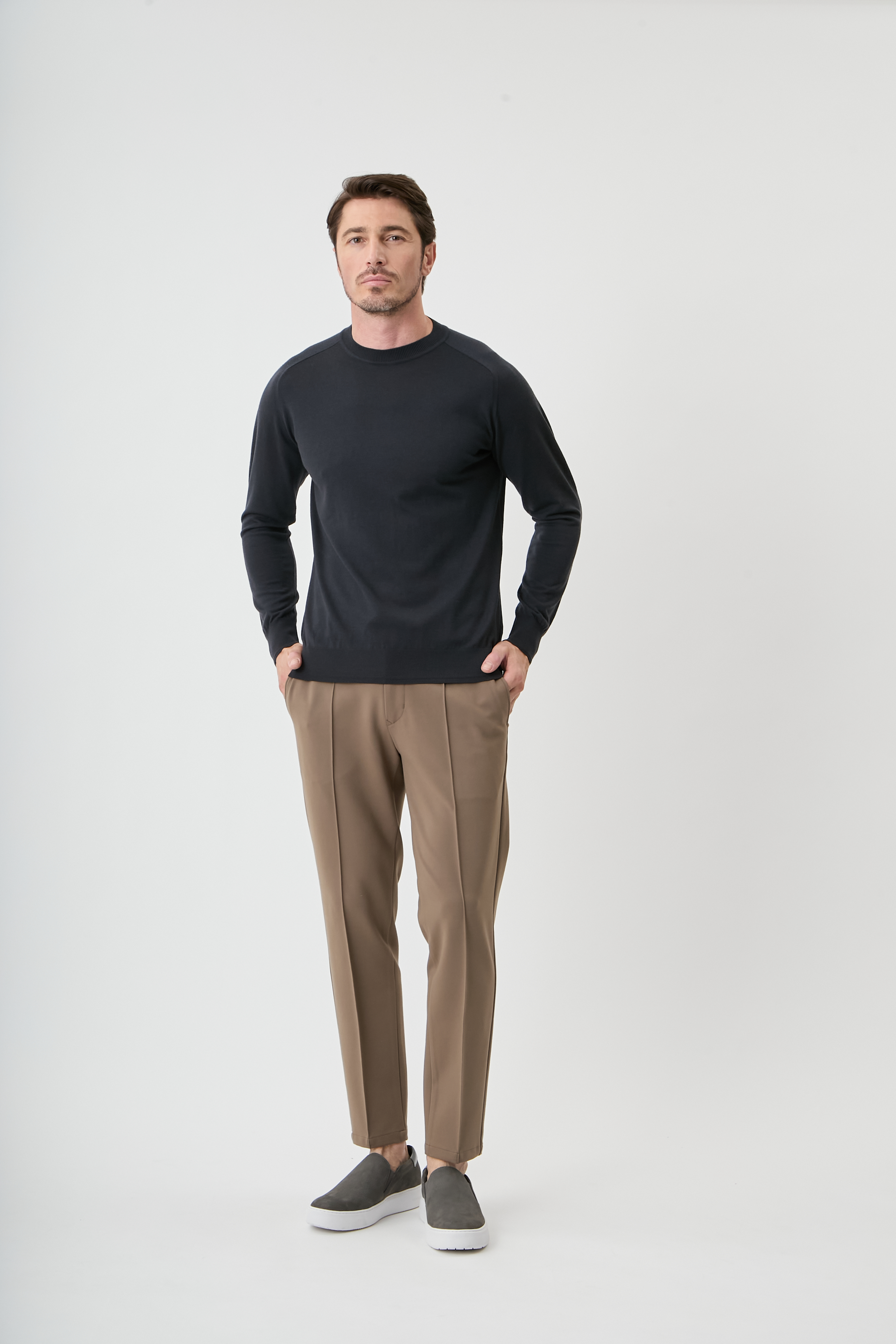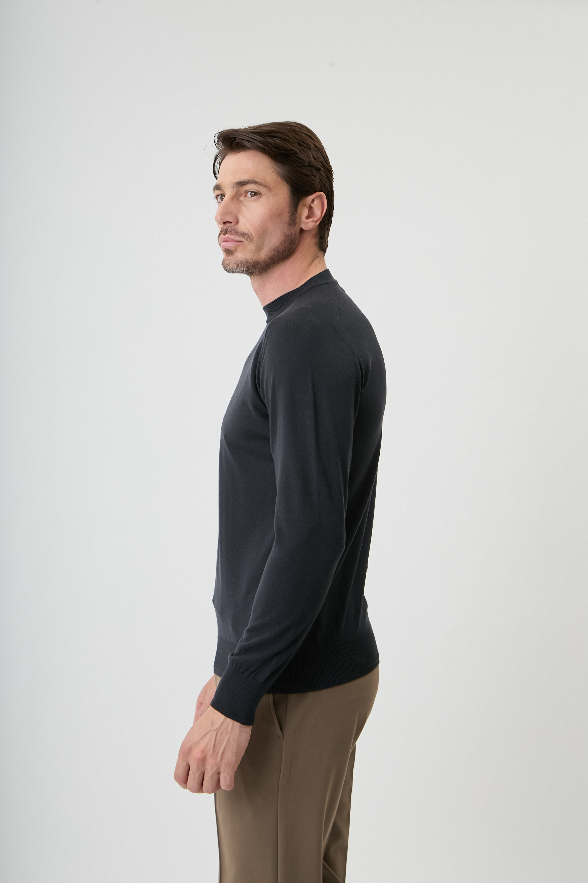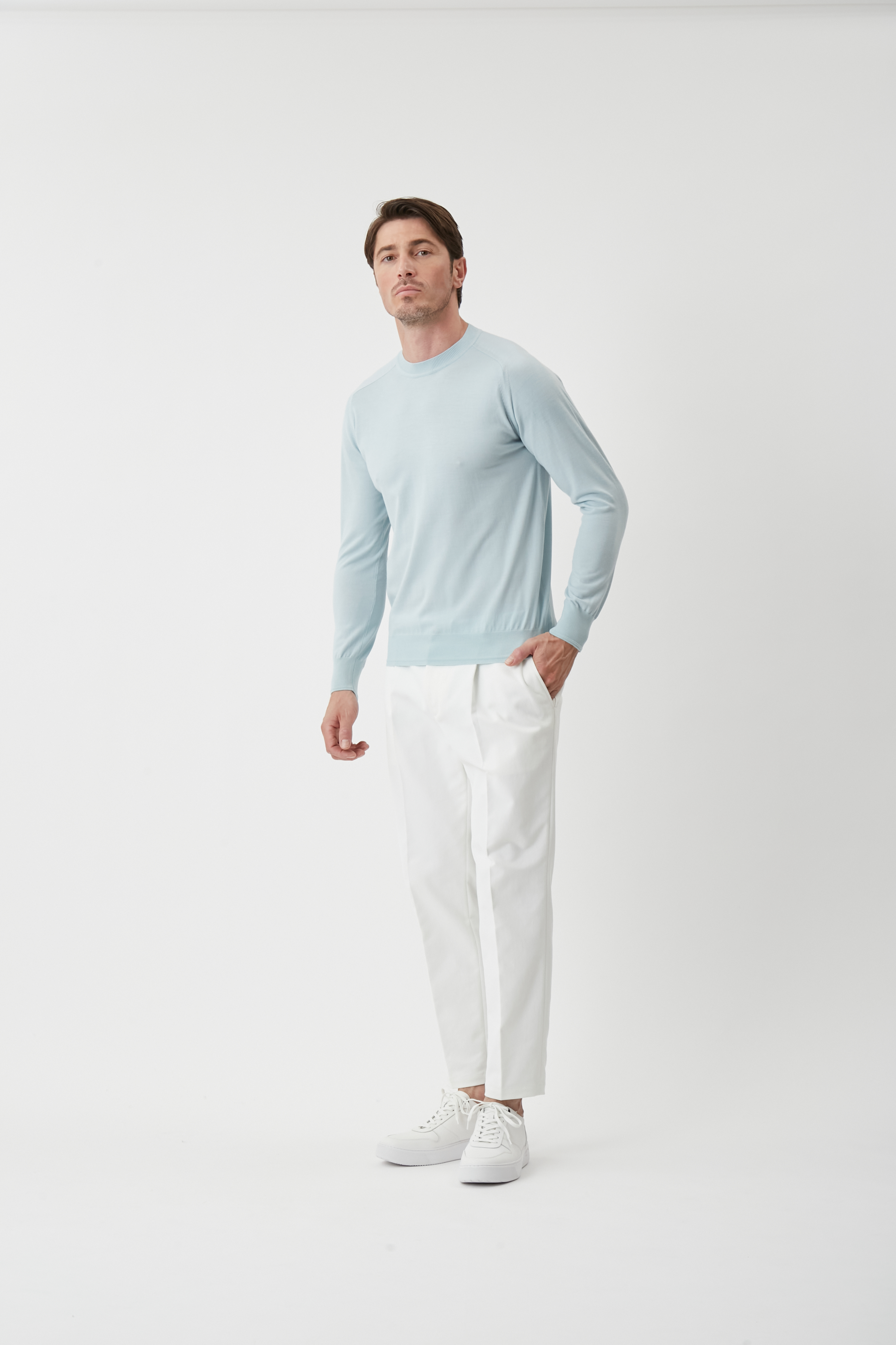 上質なウールならではの光沢と発色を活かした、ハイゲージクルーネックニット。