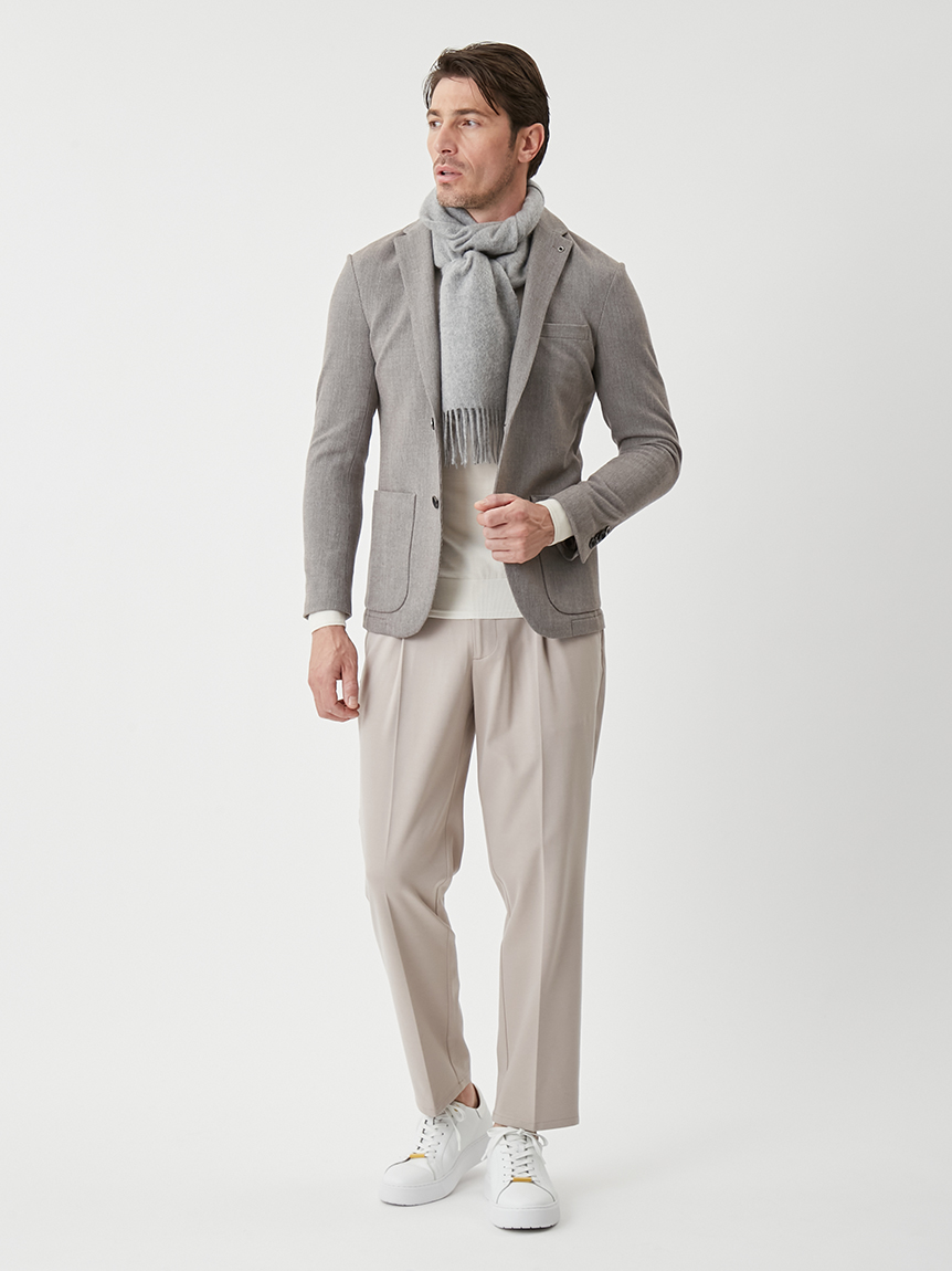 遠目には無地のように見えるほど繊細なストライプが、奥行きのある表情を生み出します。スタイリッシュな印象と、起毛素材のぬくもりを両立。