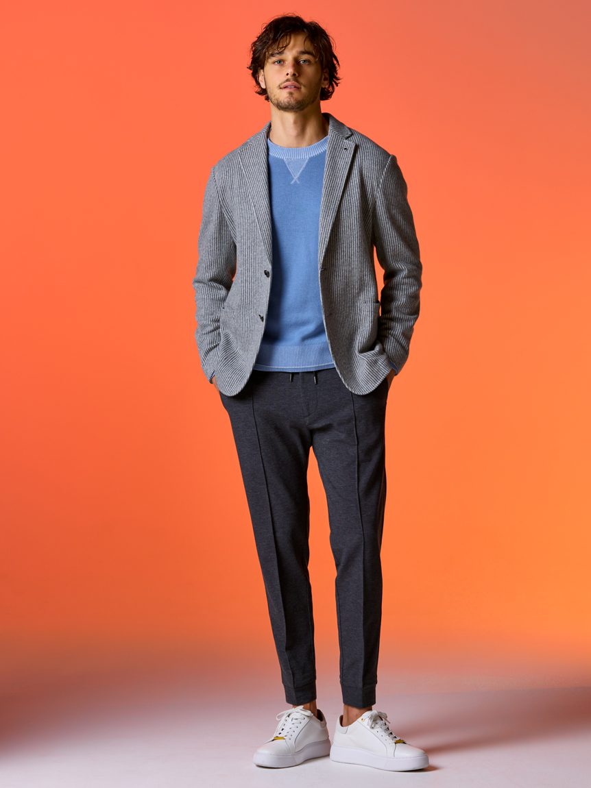 スタイルアップと快適さを兼ね備えたリブパンツ。