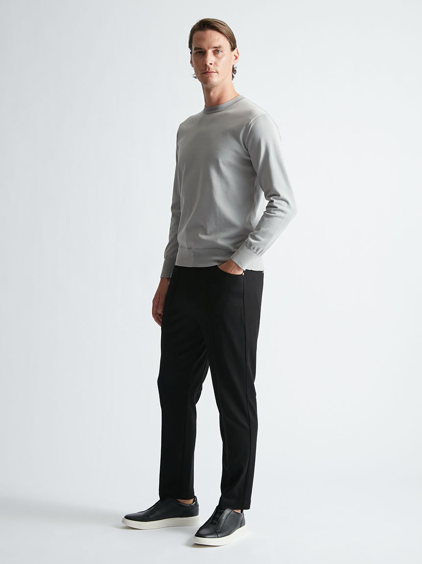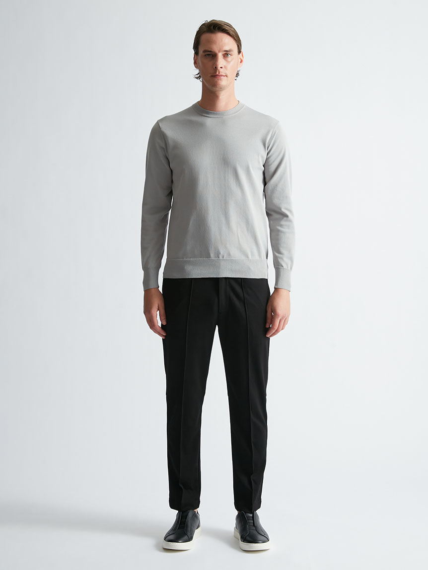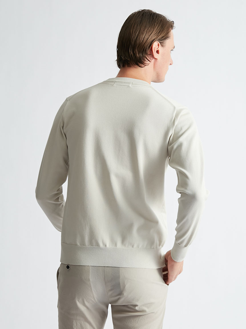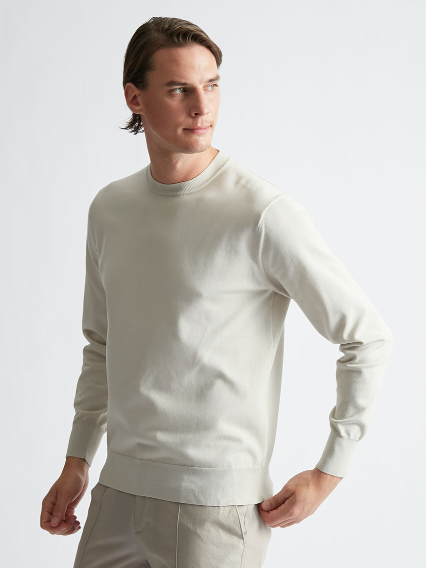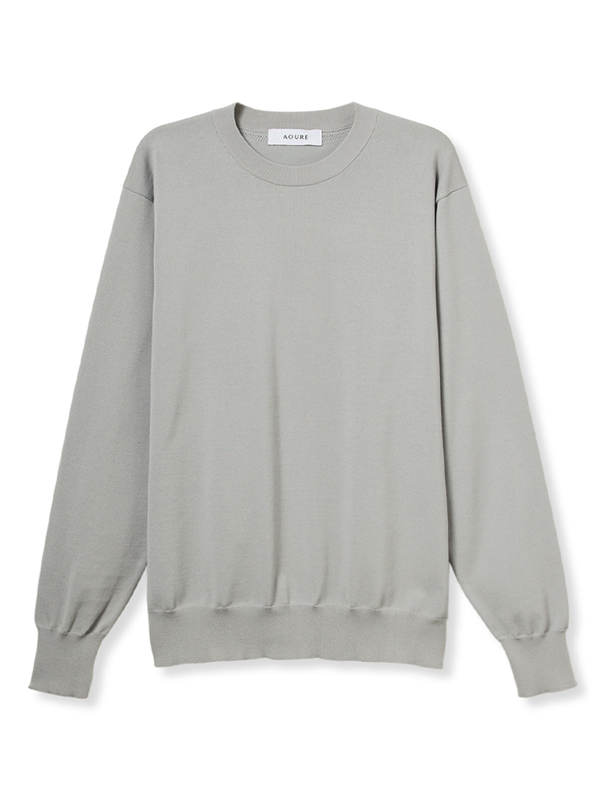 クルーネックは、ネックラインのリブ幅やテンションを繊細に調整し、詰まりすぎず開きすぎないバランスに。