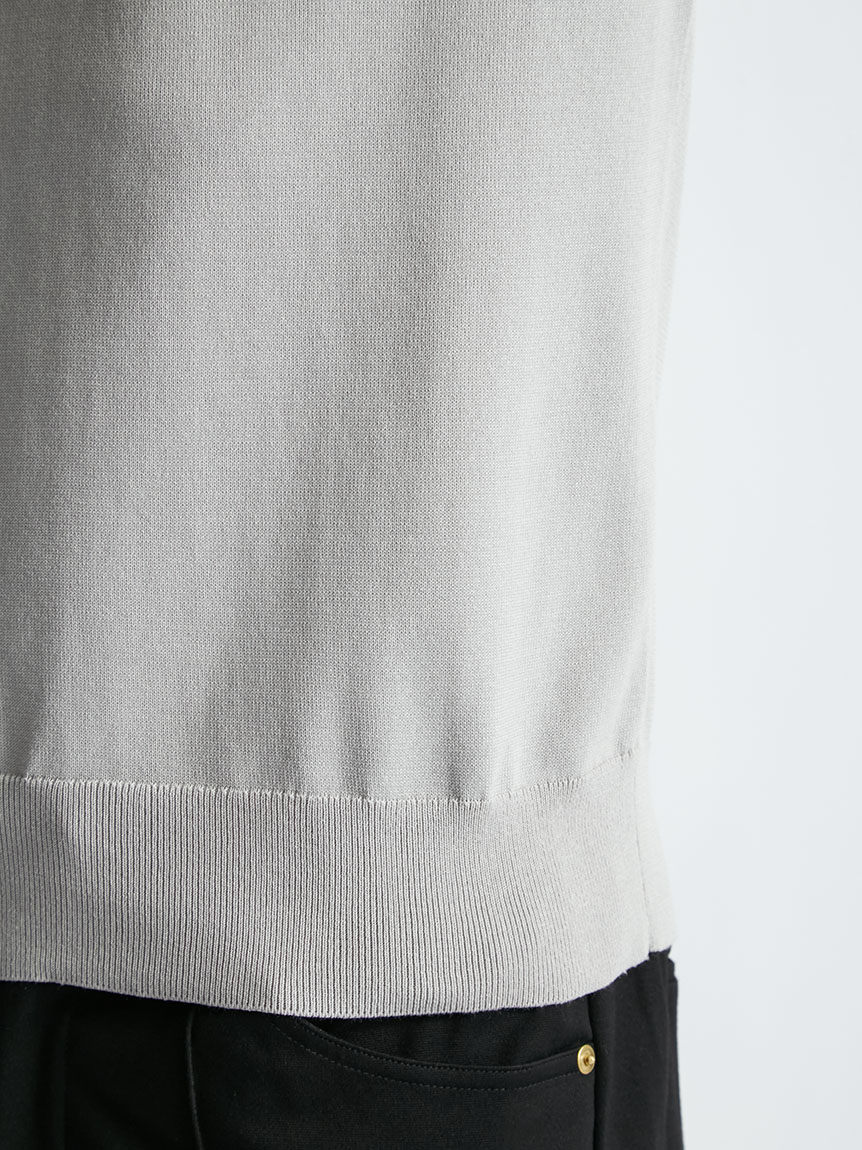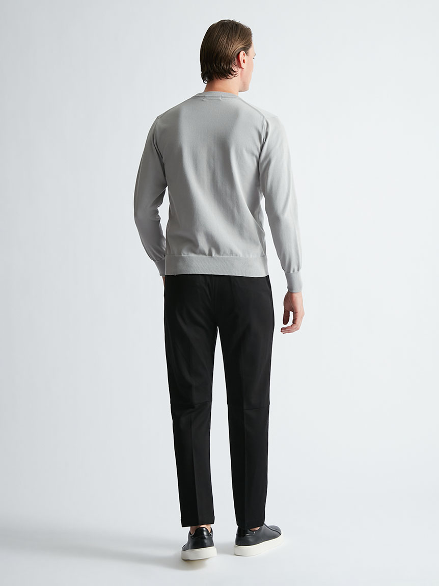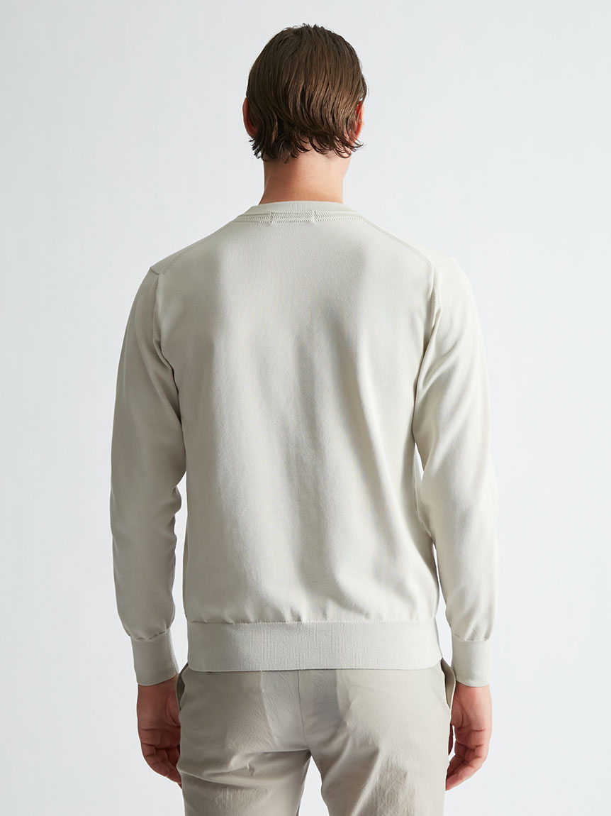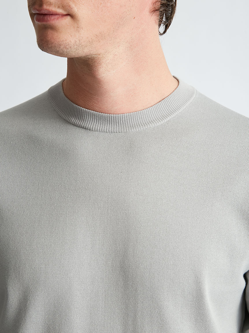 クルーネックは、ネックラインのリブ幅やテンションを繊細に調整し、詰まりすぎず開きすぎないバランスに。
