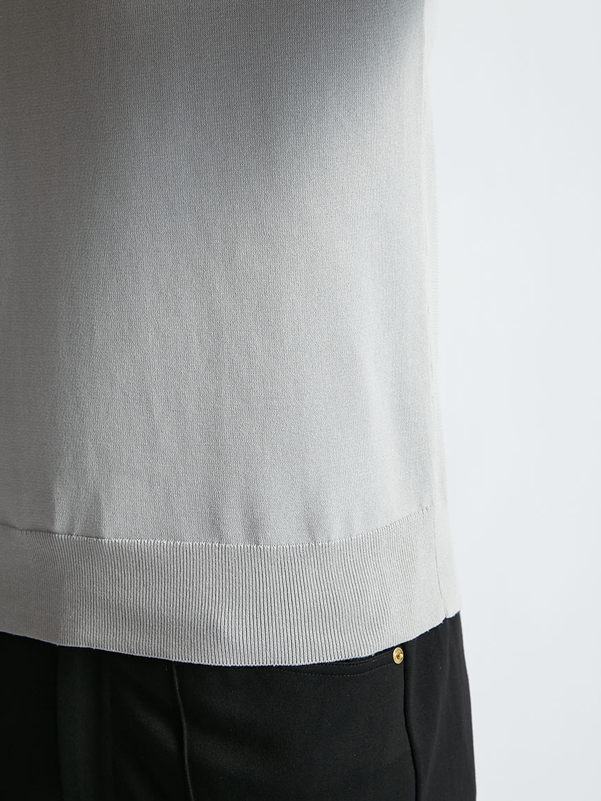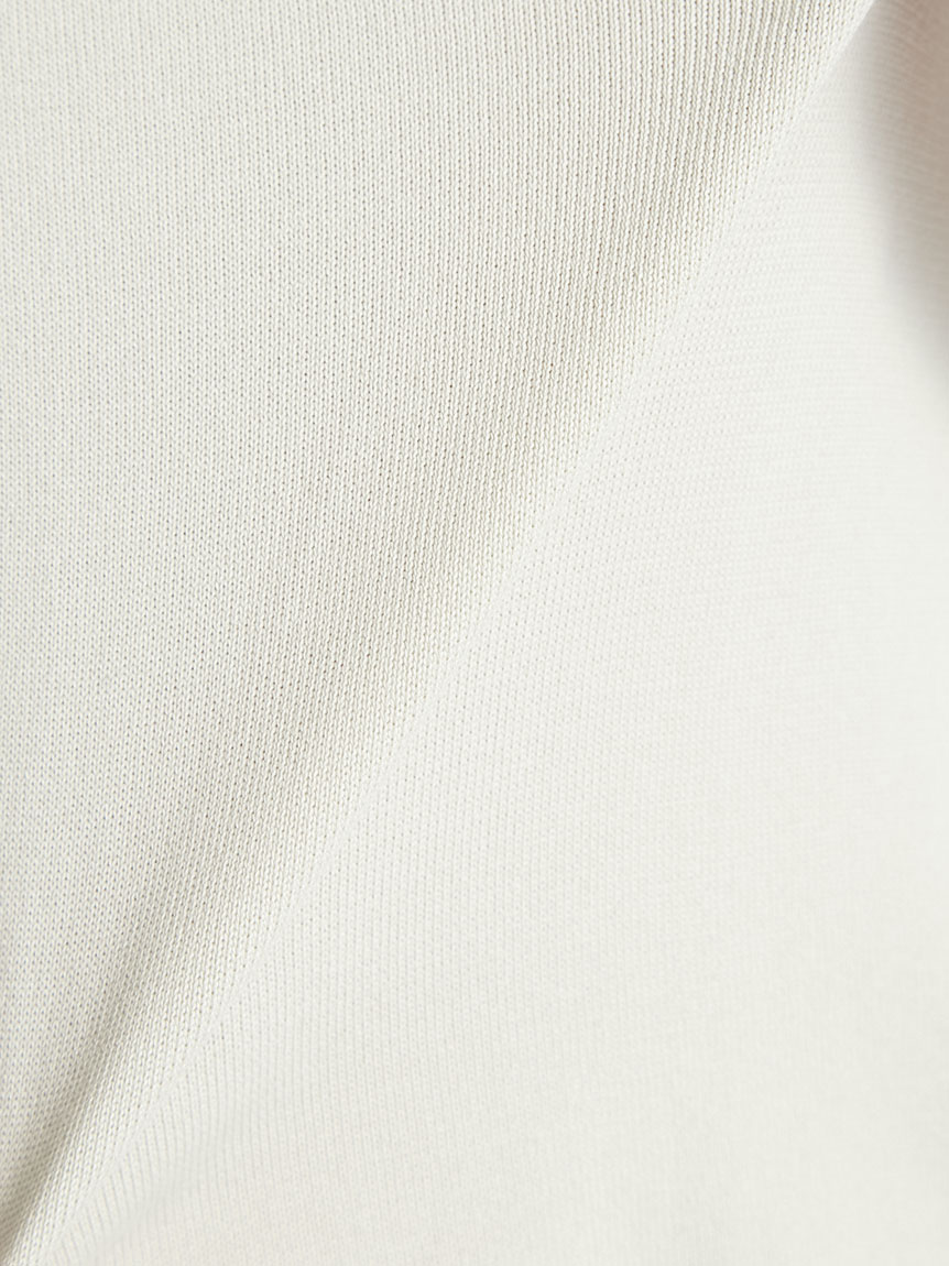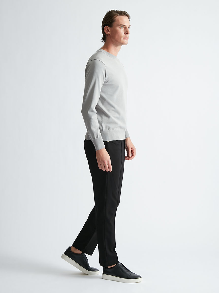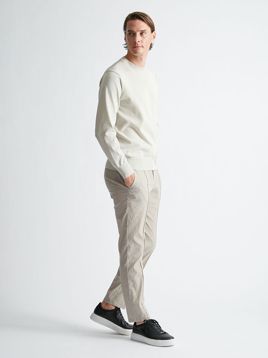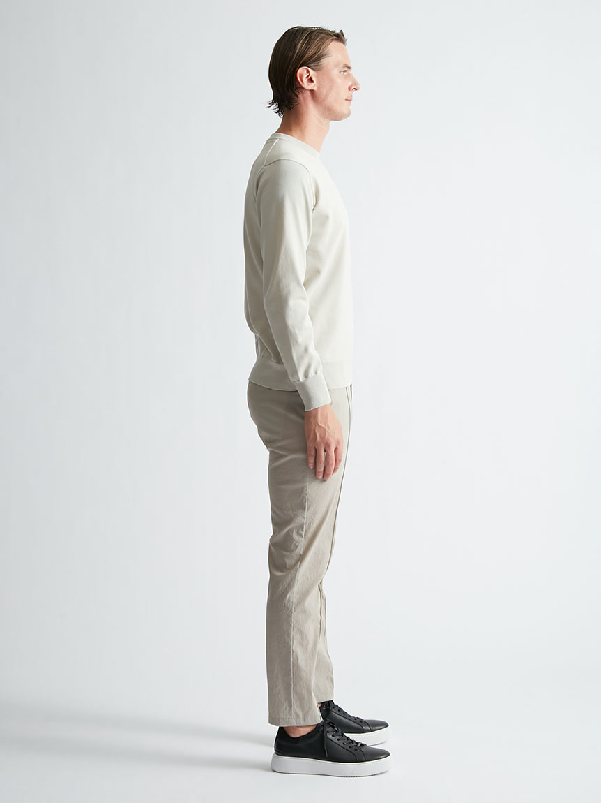 クルーネックは、ネックラインのリブ幅やテンションを繊細に調整し、詰まりすぎず開きすぎないバランスに。