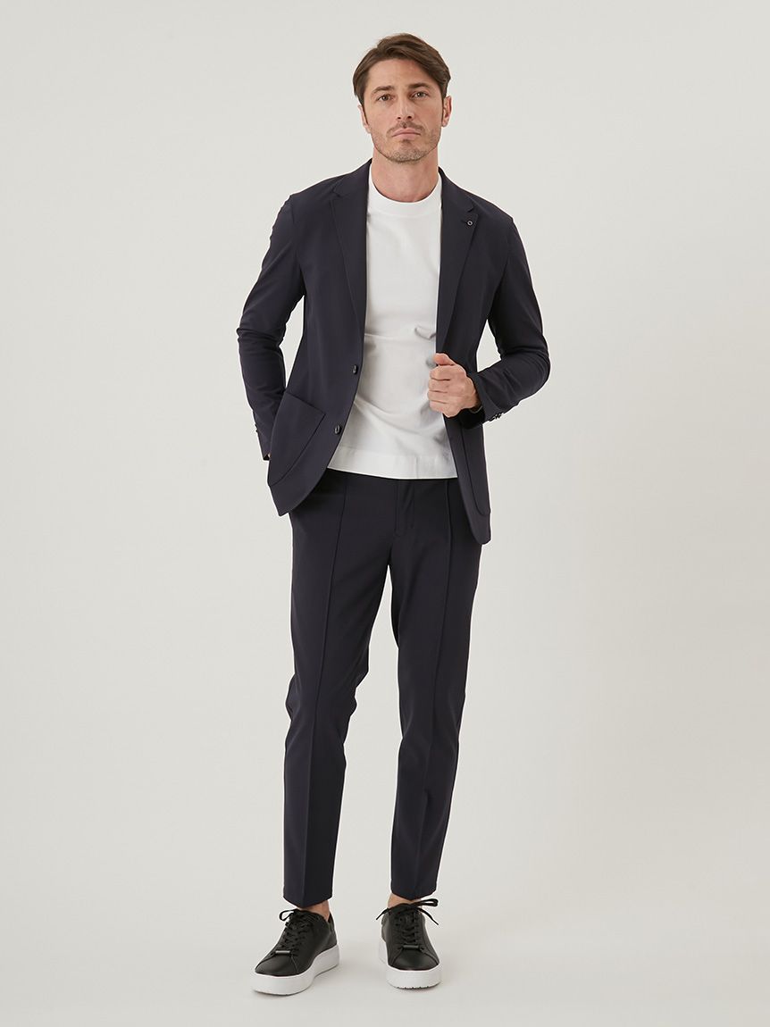 セットアップ対応可能なパンツのシルエットに合わせジャケットもコンパクトに設計し、シャープな顔に仕立てています。フロントのカッティング、腕まわりの設計にこだわり、スタイリッシュな印象にデザインしました。素材の伸縮性を存分にいかし、腕の可動域も広範囲にとれ、シャープなシルエットながら快適な着心地を実現しています。