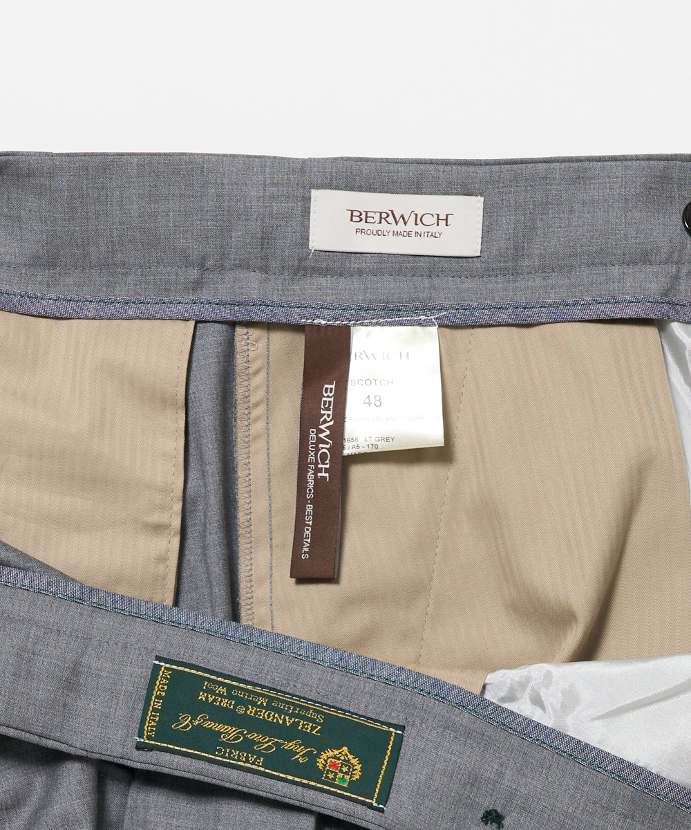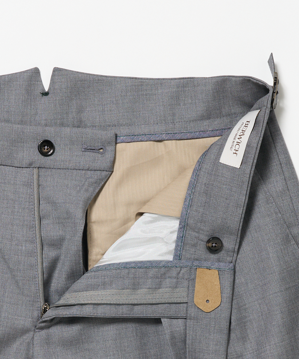 BERWICHを代表する定番モデル「SCOTCH(スコッチ)」は、2プリーツを備え、サイドアジャスター付き・ベルトループなしというクラシックなディテールを踏襲しながらも、現代的なフィット感を併せ持つ一本。