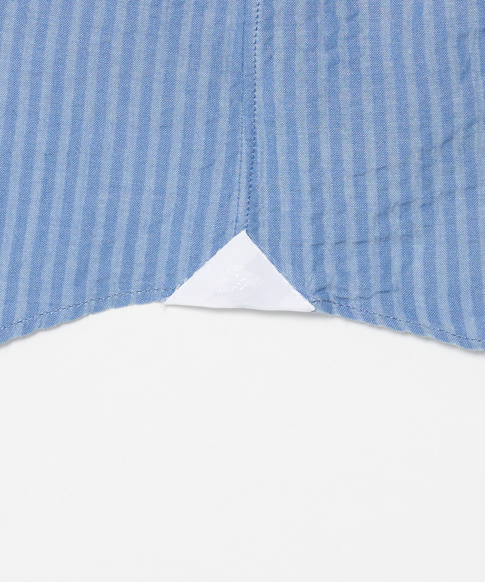 ひときわ清涼感のあるシアサッカー素材を使用した一着。サラリとした肌触りで、ベタつきにくく、さらにシワになりにくいのも魅力です。ブルーを基調にしたストライプは、上品な印象を保ちつつ、縦のラインがシルエットをすっきり見せます。大人のビジネスカジュアルやクールビズスタイルに合わせれば、清潔感と軽やかさを演出。一方で、ジャケットを外してラフに着こなすことで、休日のリラックススタイルにも自然になじむ汎用性の高さも魅力です。夏の装いに欠かせない、快適さと品格を兼ね備えた一着と言えるでしょう。