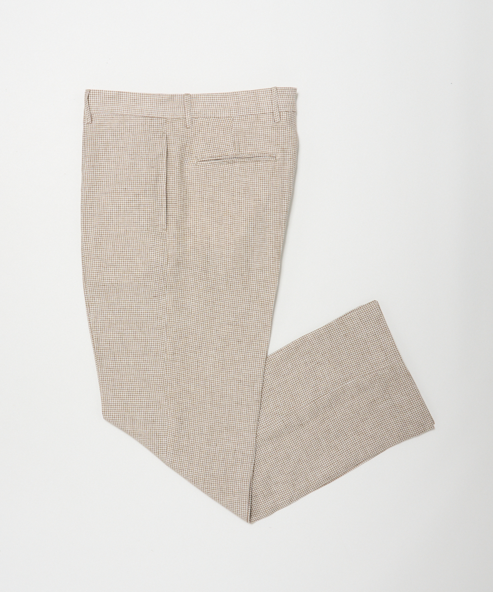 リネン100%にグレンチェックをあしらった、大人の遊び心を感じさせる一本。カラーは二色展開です。ブルー×ブラックの組み合わせは、クールなダークカラーのパンツながら程よく軽やかな印象に仕上げています。ホワイト×ベージュは、柔らかな印象を与えつつも、しっかりと存在感を放つ、センスが光る一本です。リネンならではの清涼感と軽やかさで、春夏シーズンのコーディネートに最適。程よく個性を演出したい方にもおすすめです。