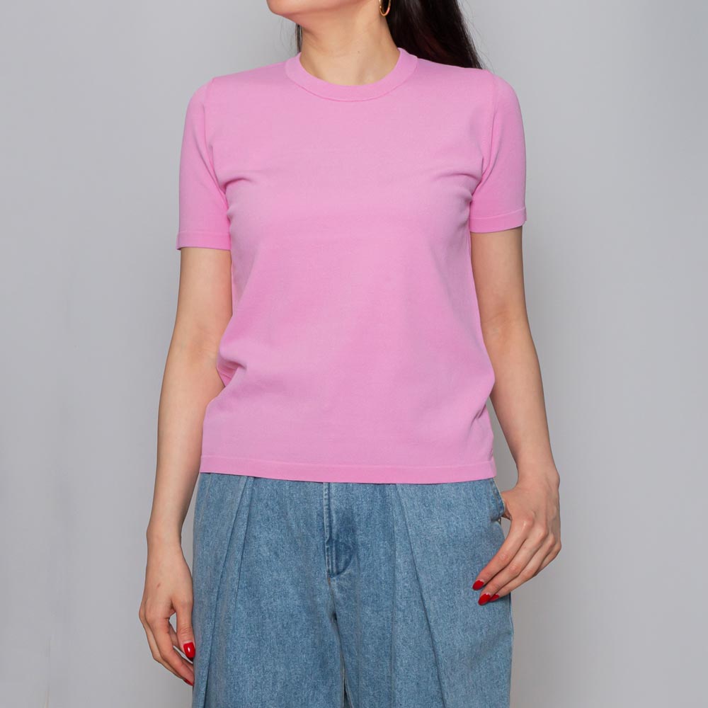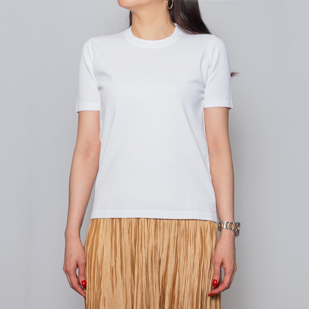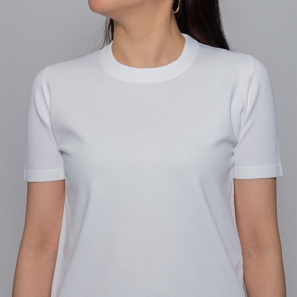 Tシャツのデザインを伸縮性抜群のハイゲージニットに落とし込みました。