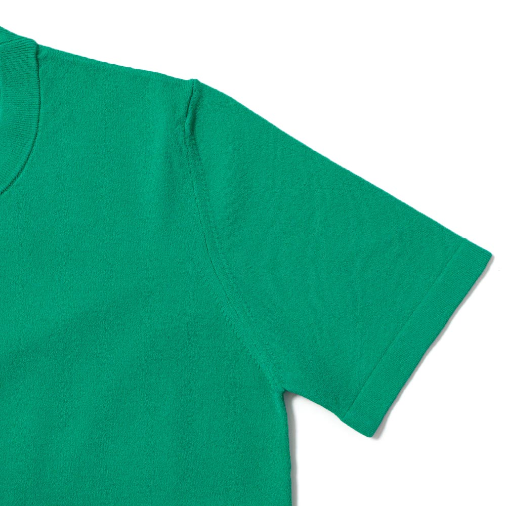 薄手で柔らかい手触りを維持しながらも、ニットにポリエステルをブレンドすることで身体へのフィット感を絶妙に落ち着かせています。