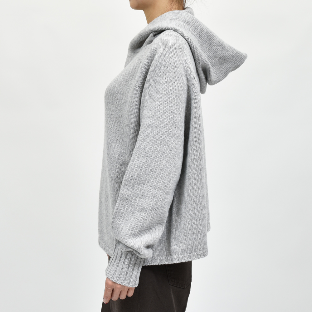 フード付きニットのデザインはカジュアルながらもしなやかな肌触りが大人のリラックススタイルを演出します。