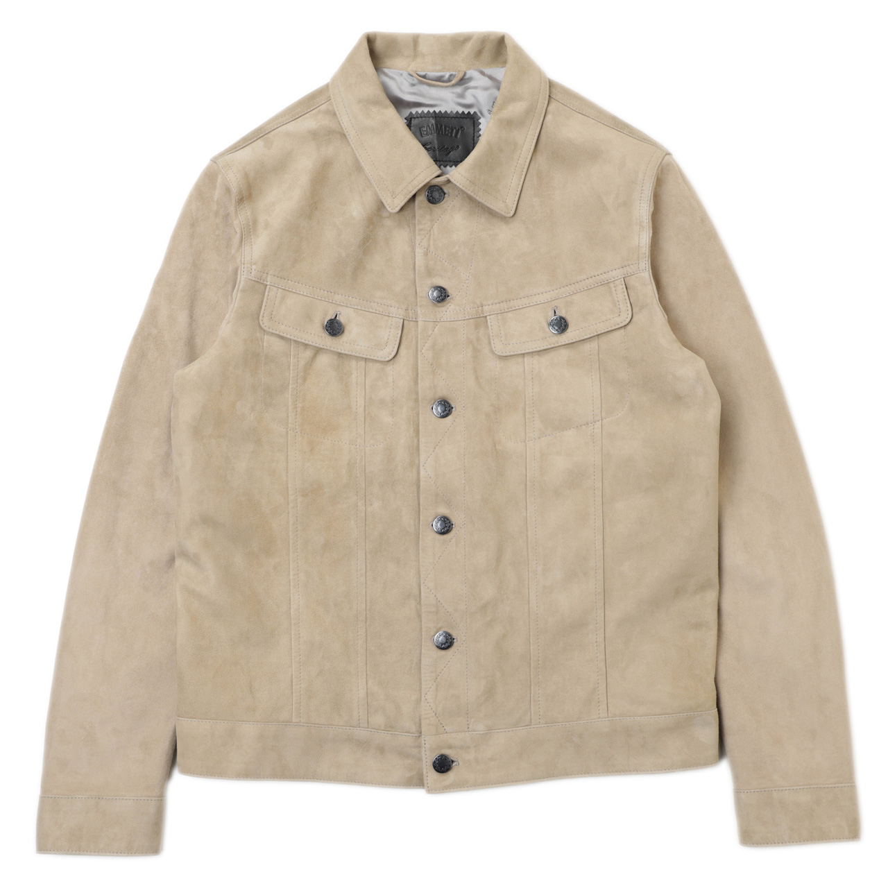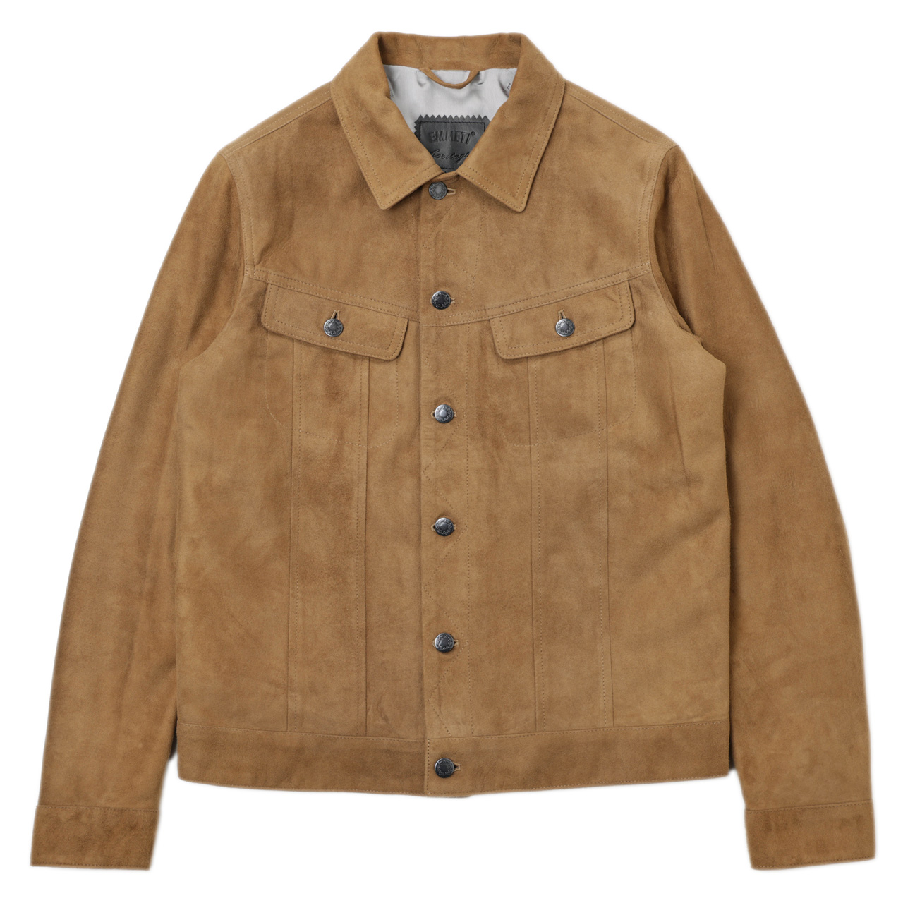 こちらは襟付きショートブルゾンの定番、トラッカージャケット。いわゆる“Gジャン”ですね。ウエストを絞らないボックス型のシルエット、フロントボタン、両胸の2フラップポケットなどのデザインはオーセンティックですが、襟や袖など着心地を左右する箇所は手作業で縫い付けられています。身返しもあり、内ポケットが配されるなど、ガボならではのサルトリアーレ(=テーラードの技法)が駆使されていることがよくわかる仕上がりです。