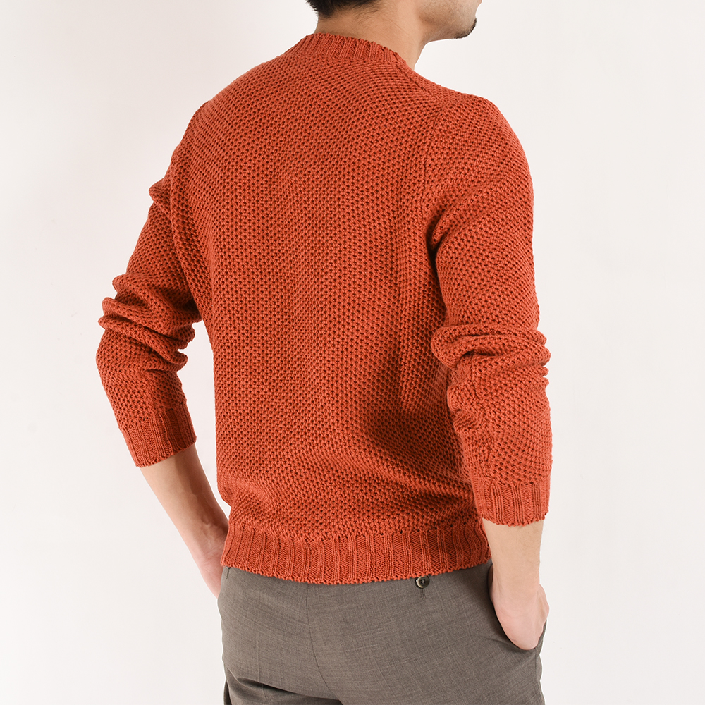 ・素材はリネン&コットン。細い糸を撚り合わせてミドルゲージにしており、リネン特有のザラっと感のない柔らかみのあるタッチです。ゆえに素肌でも快適な着心地が得られます。