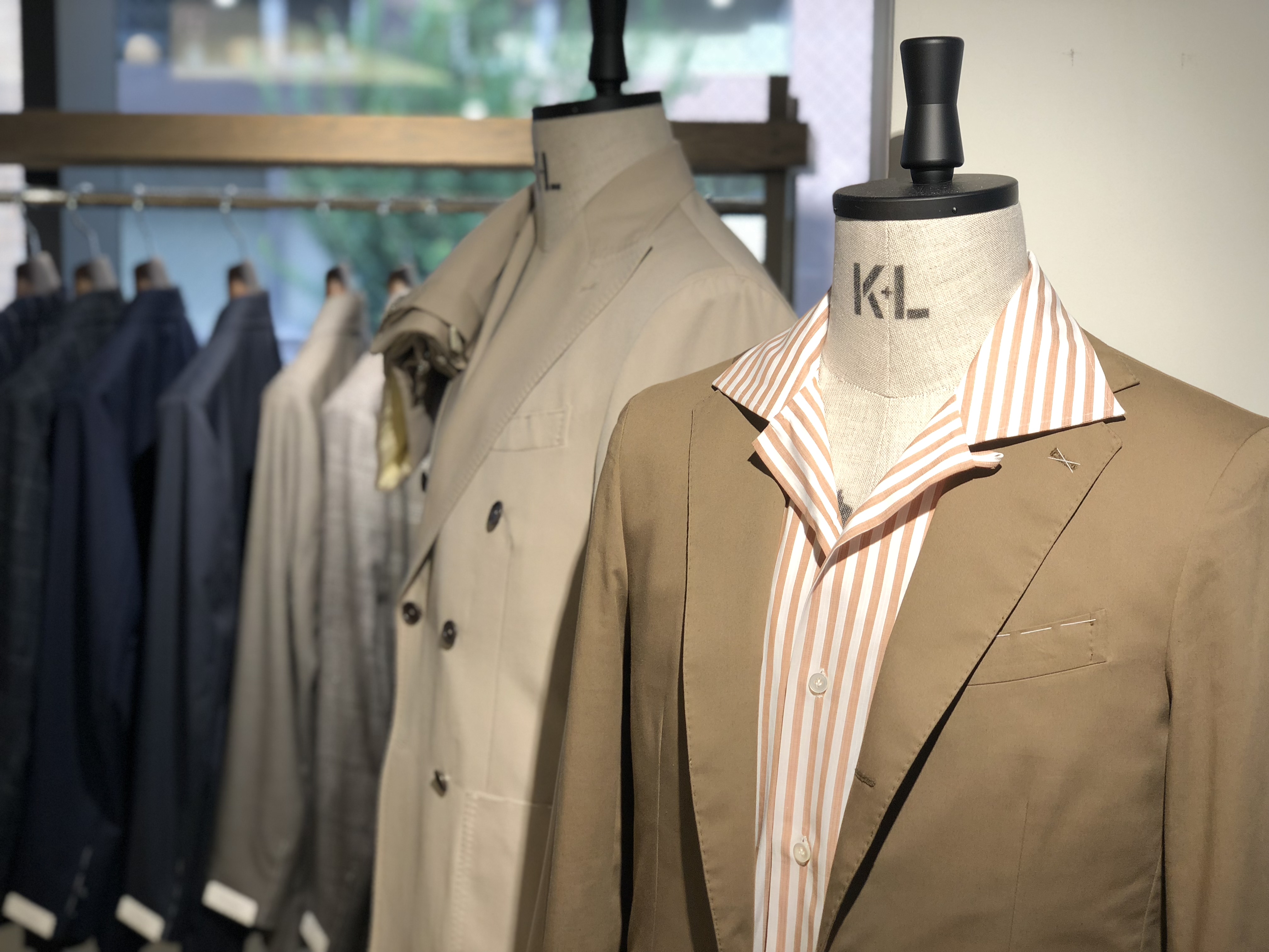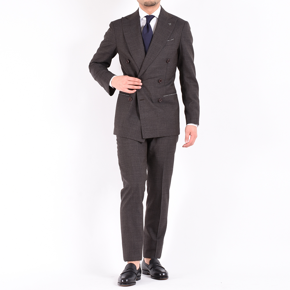 ・ジャケットのモデルはハーフキャンバス仕立て6つボタン両玉縁ポケットの"SORRENTO"です。ややワイドでほのかに丸みあるグラマラスなラペルが特徴。生地を多く使うという意味でダブルブレステッドはラグジュアリーな雰囲気を醸します。
