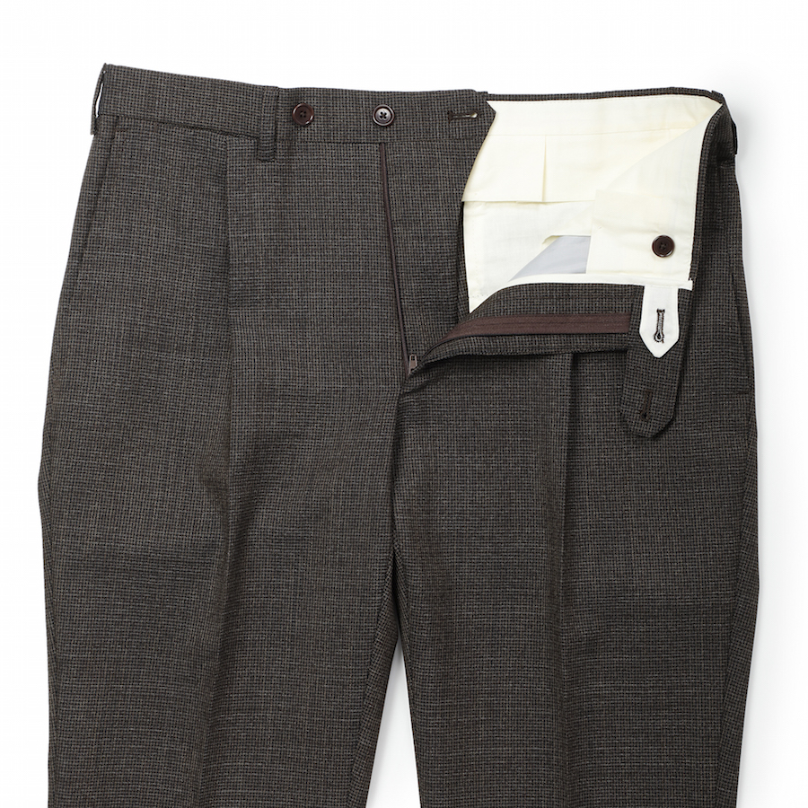 ・ブラウンとブラックを配色したドッグトゥース生地。スーツに求められる落ち着きはあるものの、地味には見えないという稀有な一着。