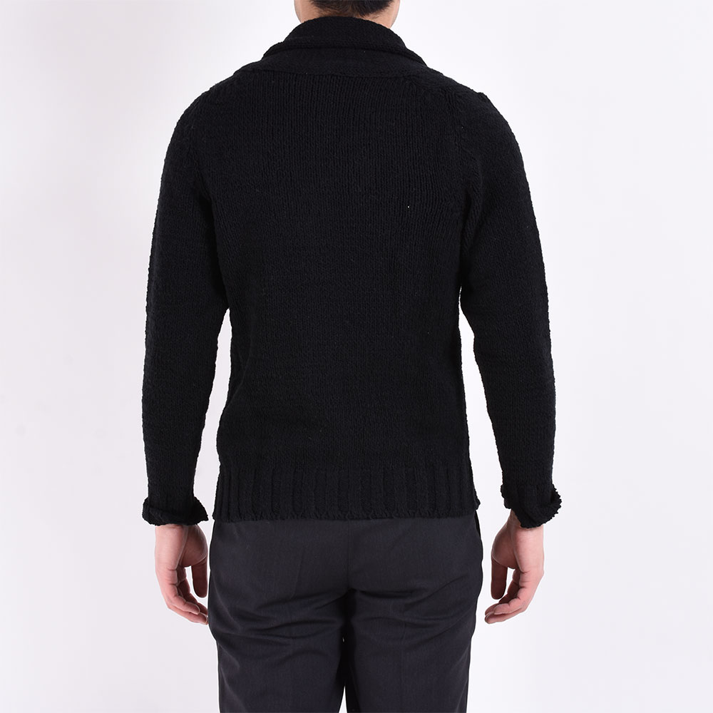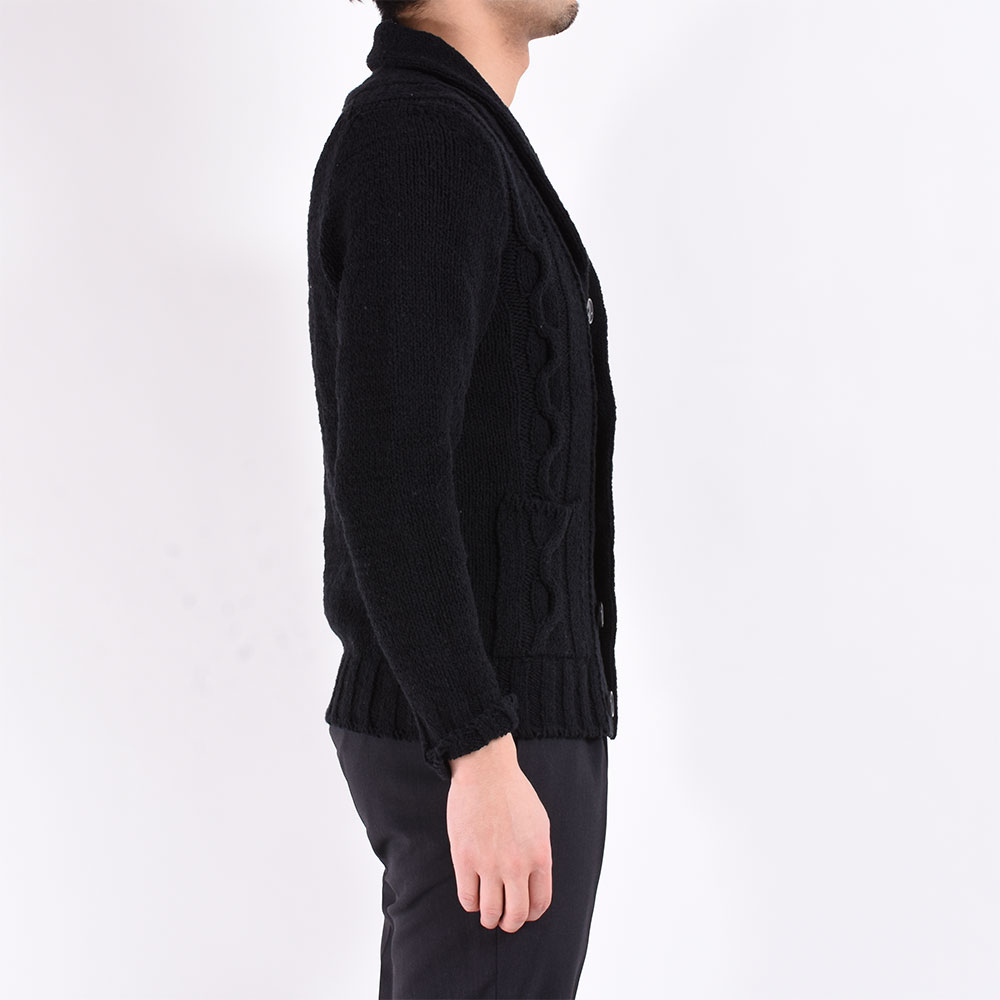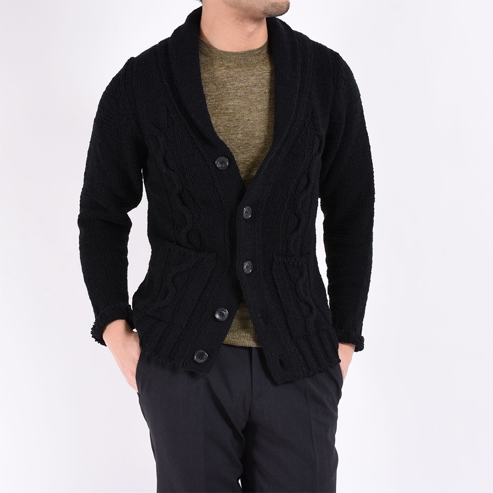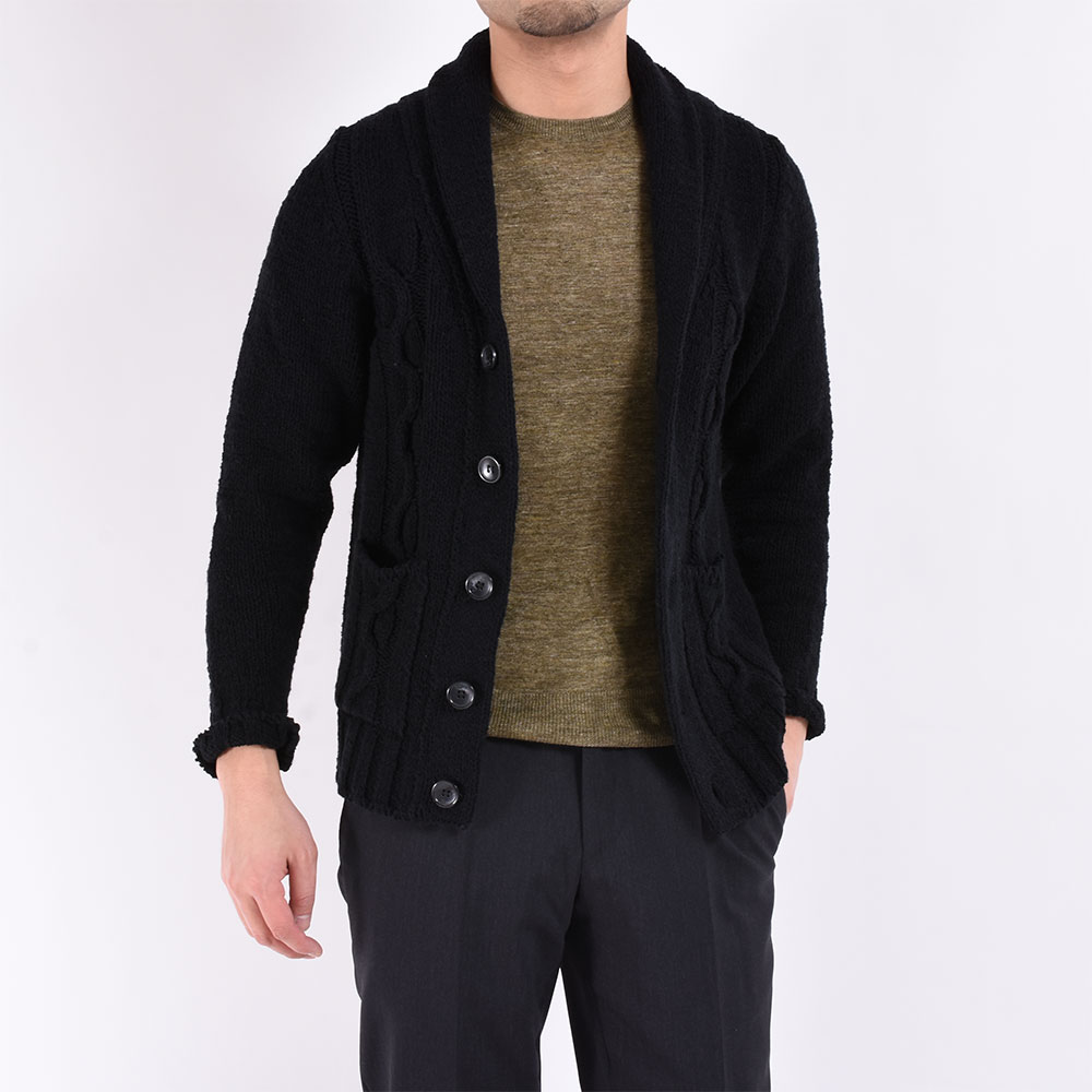 ・ショールカラー及び前立て部分は袋編みになっていますが、ほどよいボリューム感に収まります。