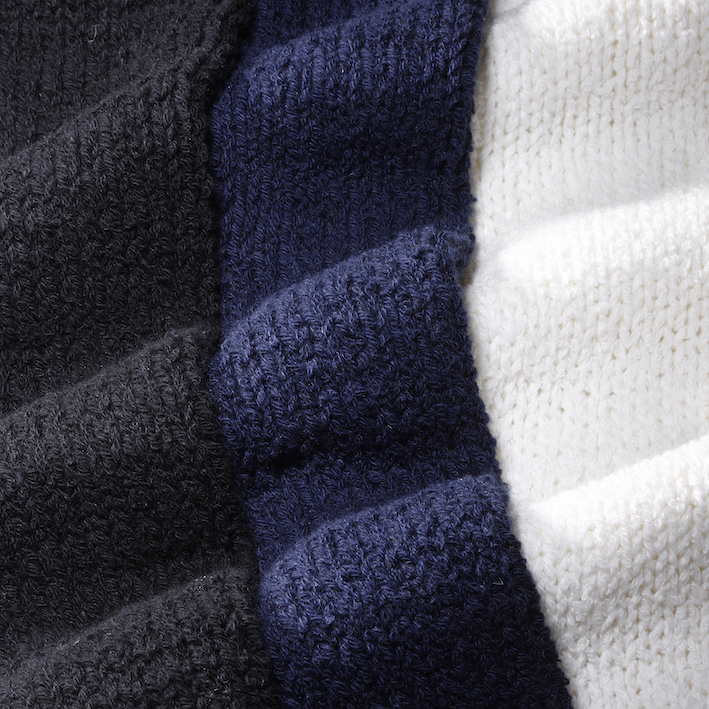 ・コットンとカシミア、シルクをブレンドした編み地は、柔らかですがほんのりドライタッチで気温の高い時期でも快適な肌当たりをキープします。