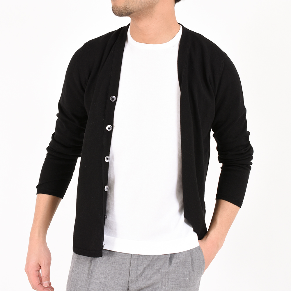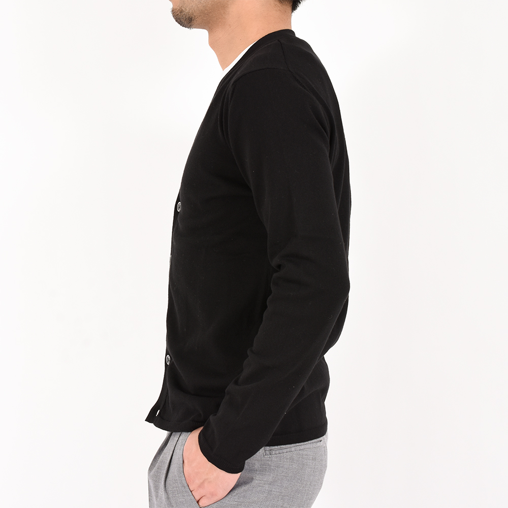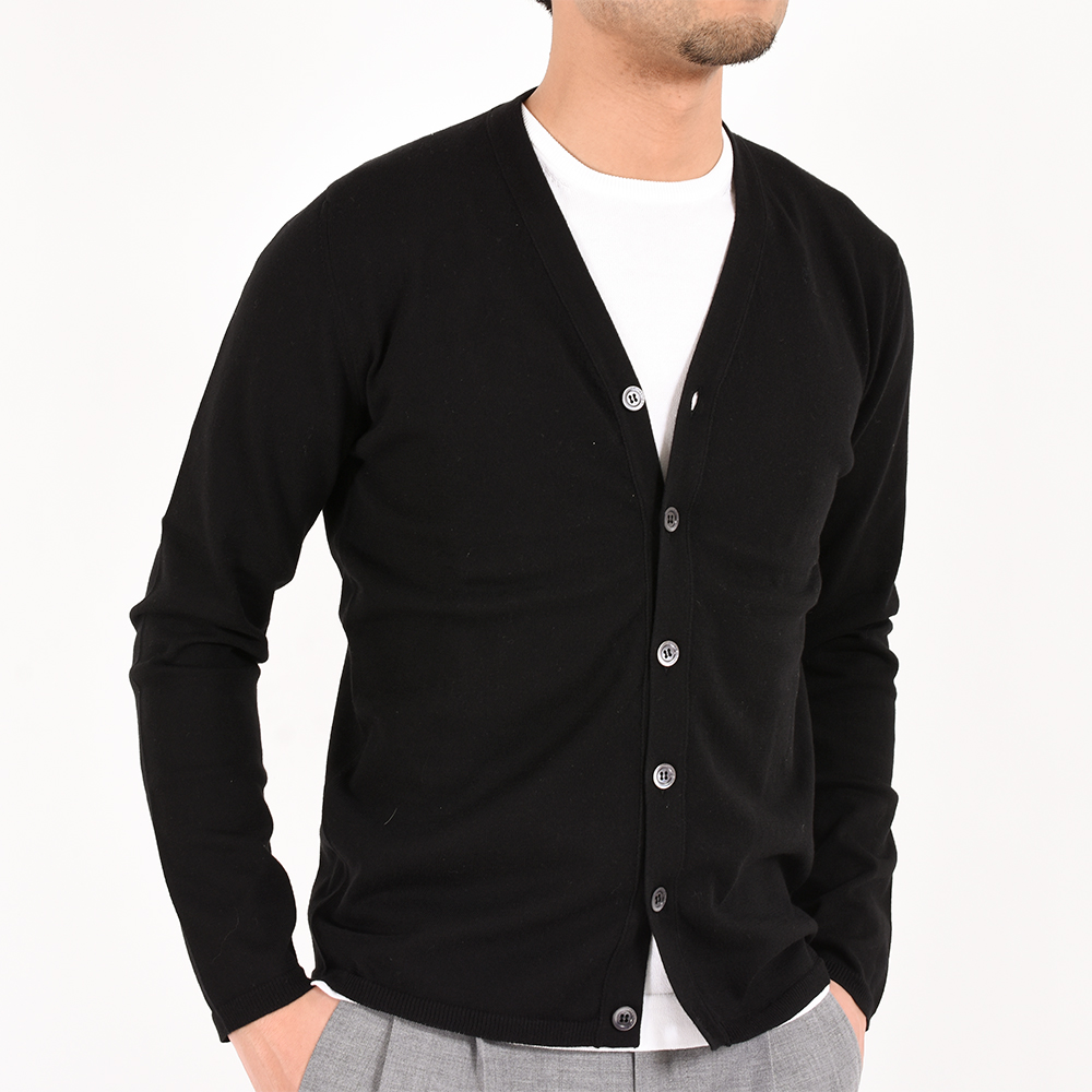 ・やや浅めなVゾーンはインナーがシャツでもカットソーでもバランス良く見え、上にジャケットを羽織ってレイヤードした際の見える分量も丁度良いあんばいに収まります。ベーシックな4色をご用意しました。