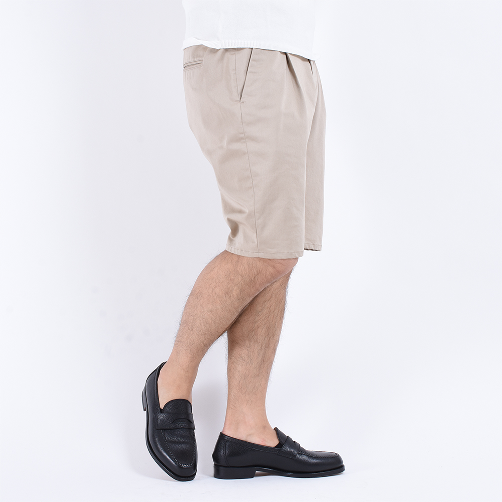 ・「gab's ARCHIVIO(ジャブスアルキヴィオ)」を代表するモデル"MASACCIO(マサッチョ)"のディテールを取り入れた1プリーツショーツ。両サイドウエストにシャーリングゴムが入ることによってウェストに沿う腰廻りを実現しつつ、プリーツによってゆとりあるヒップ廻りでストレスの無い快適な穿き心地です。丈は膝上くらいでスッキリと見え大人顔。