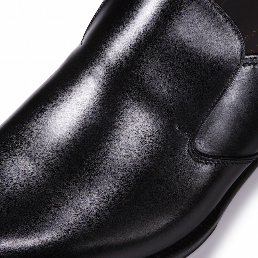 ・アッパーレザーのキメ細かさとツヤ感は圧倒的。その理由は最高級カーフレザーで名を馳せるフランスはデュプイ社のANILOU(艶つけされた靴用アニリンカーフ)を使用しているから。カーフレザーと言えば流通量が多いですが、本物のカーフレザーは…、コチラです。履けばその良さを体感して頂けるはず。