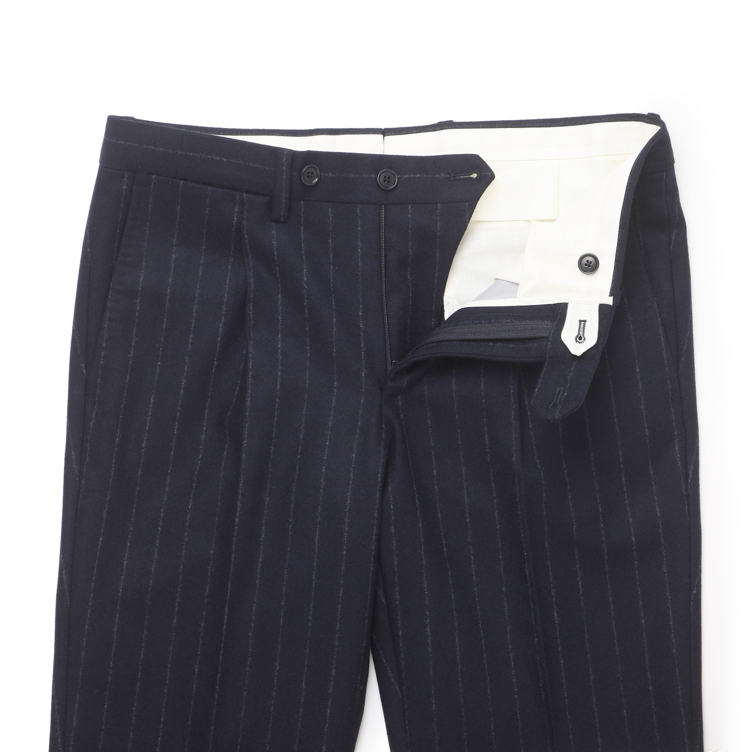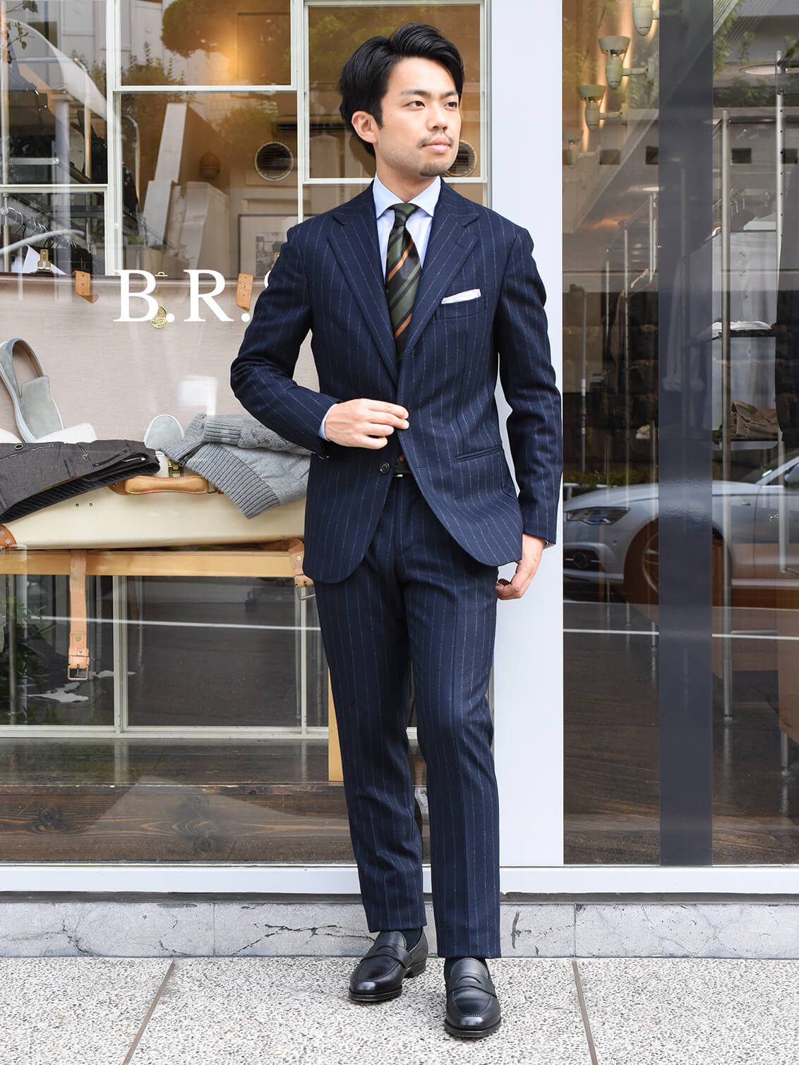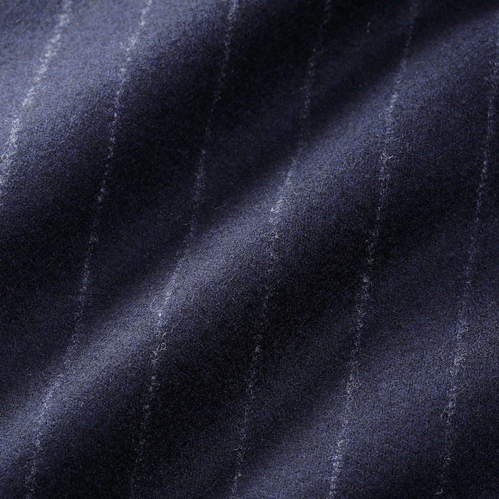 ・秋冬らしい量感と起毛感を備えた生地と言えばフランネル。そのフランネルにチョークストライプをあしらったのがこちら。ベースの色とあまりコントラストが付けられていない控えめなストライプをセレクトしたのはB.R.SHOPのこだわり。クラシカルに見え過ぎないのがポイントです。