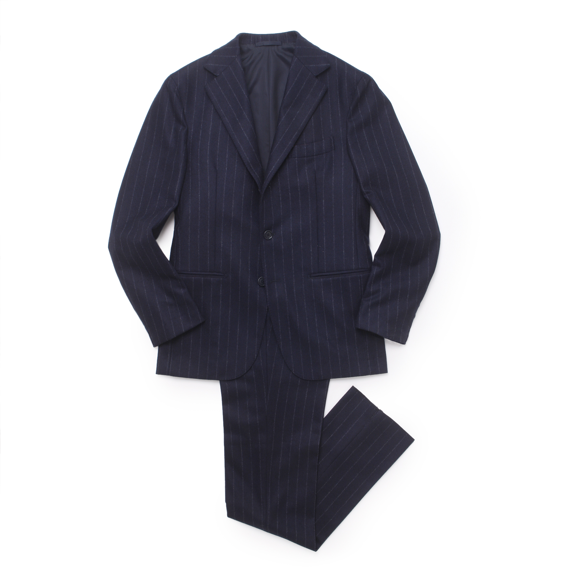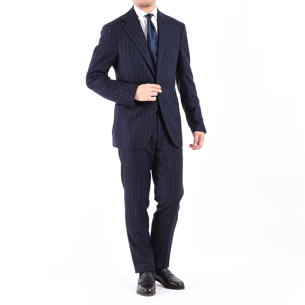 ・ジャケットのモデルは、ハーフキャンバス仕立て3つボタンの"NAPOLI"です。こちらはスタンダードな9センチの襟幅でほんのりエレガントな仕上がりに。ドロップは8。ドレッシーな雰囲気をもたらすフラップ無し両玉縁の腰ポケットです。