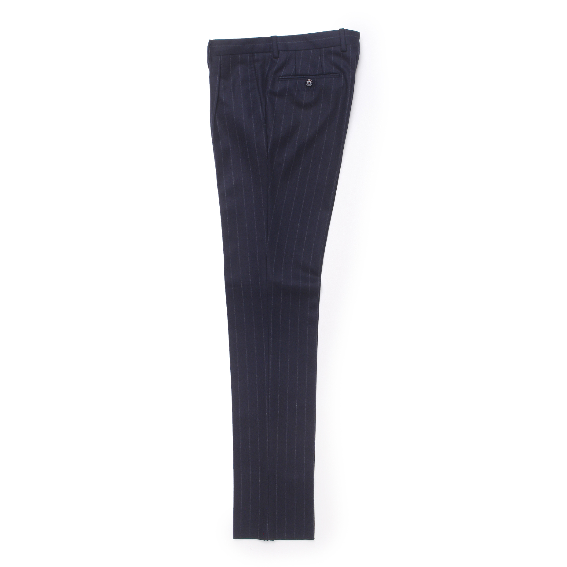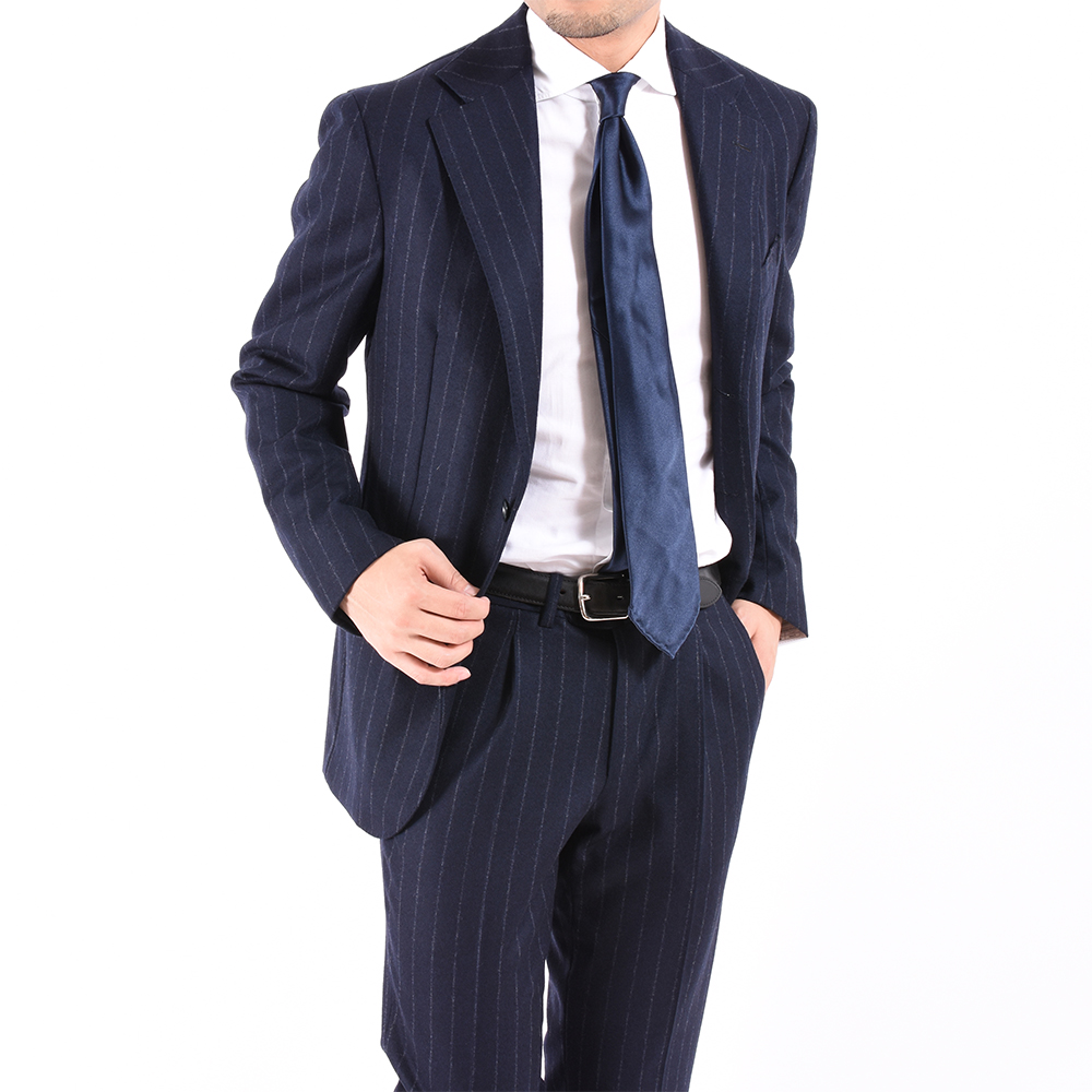 ・パンツはスリム1プリーツモデルをセレクト。「De Petrillo(デ ペトリロ)」の中で最も細いノープリーツモデルB/Sより腰周りにややゆとりはありますが、ワタリや裾幅はスリムでテーパード感の強いモダンなシルエットです。