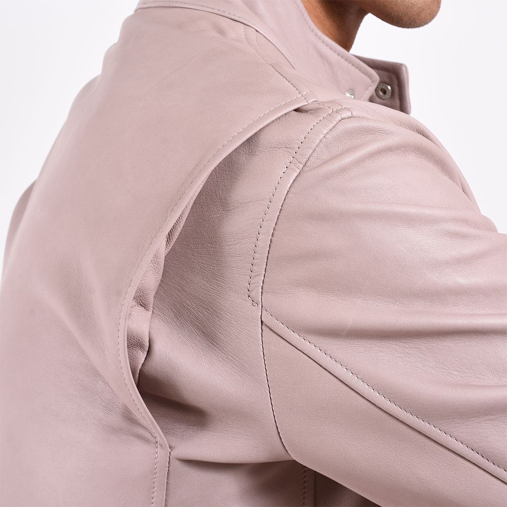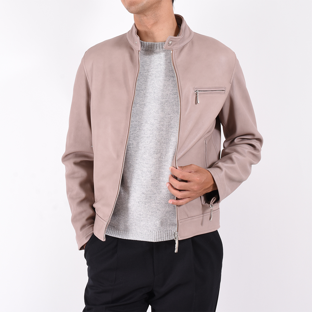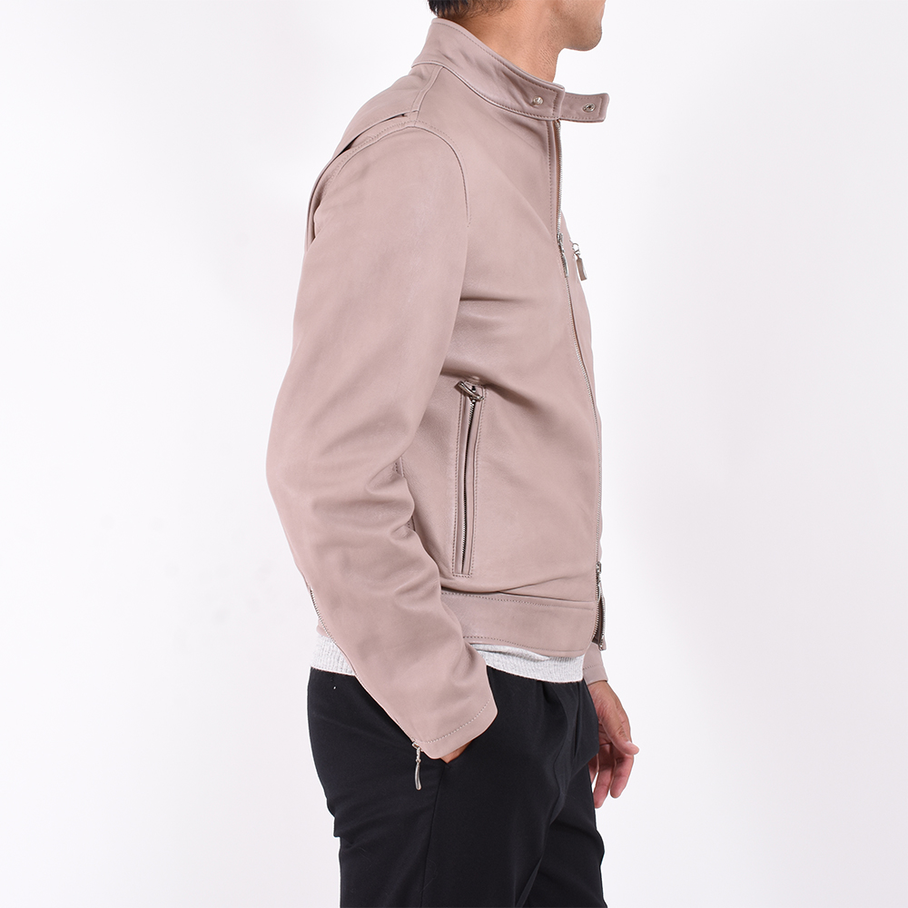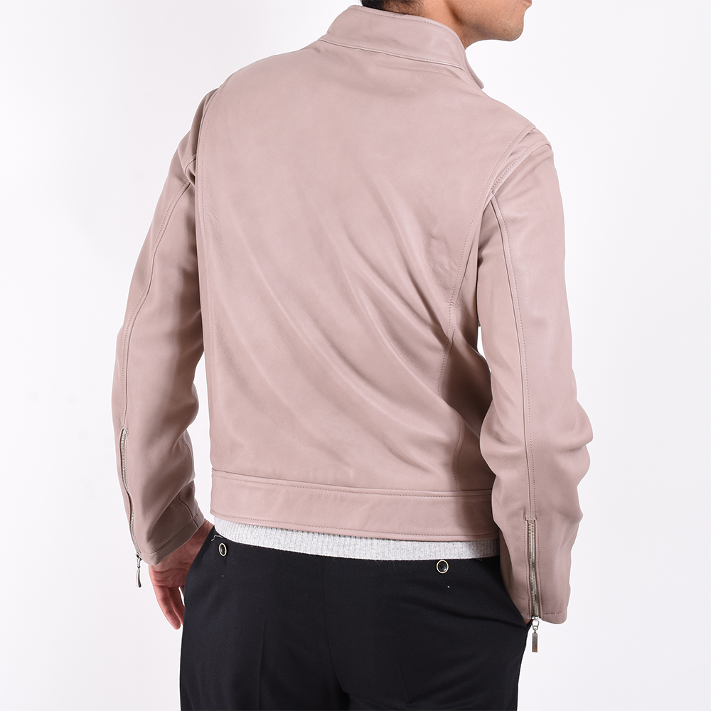 非常に滑らかな肌触りの柔らかい革を使用しているこちらのライダースは、すぐに身体に馴染むでしょう。肩後ろの両サイドのプリーツによって、腕の可動域を多く取っているのでライダース特有の窮屈さはまったくございません。ライトベージュという上品な色味は他のライダースと差が付くのは間違いなし。