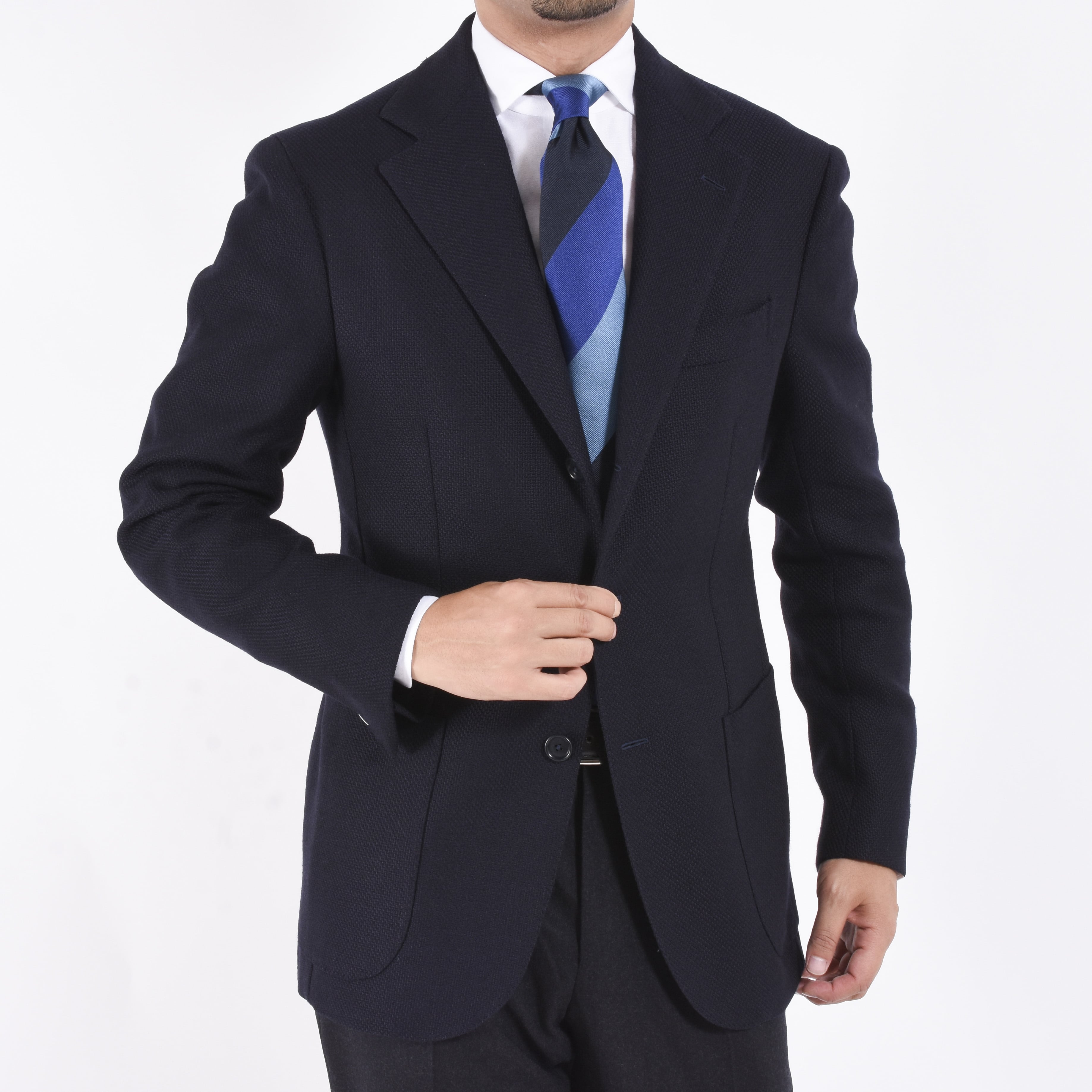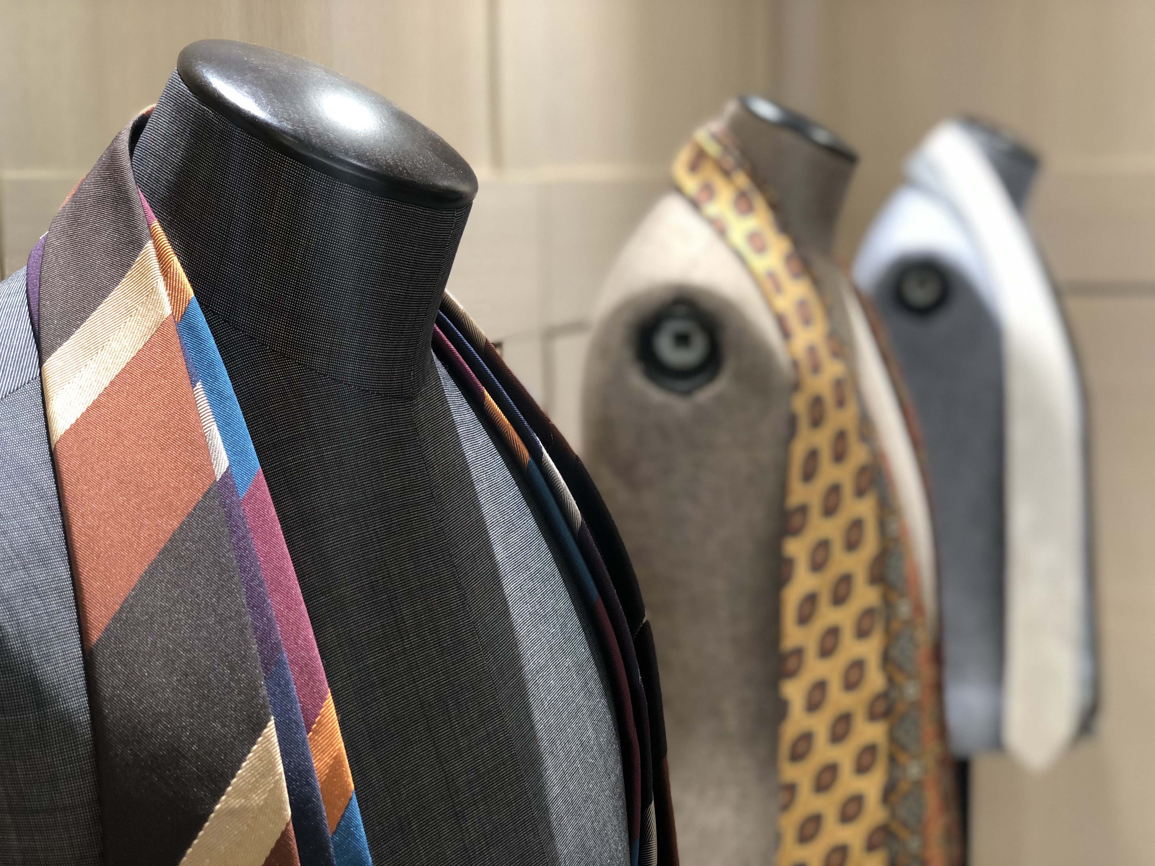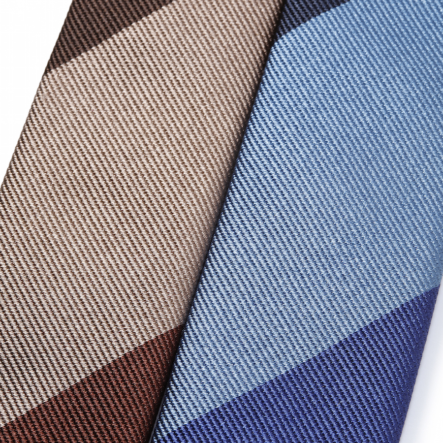 同じ感覚、幅のストライプが段落ちごとに配色が変わっている、こちらのストライプタイはベーシックなジャケットなどに合わせるだけで、一気に印象的なVゾーンに変わります。