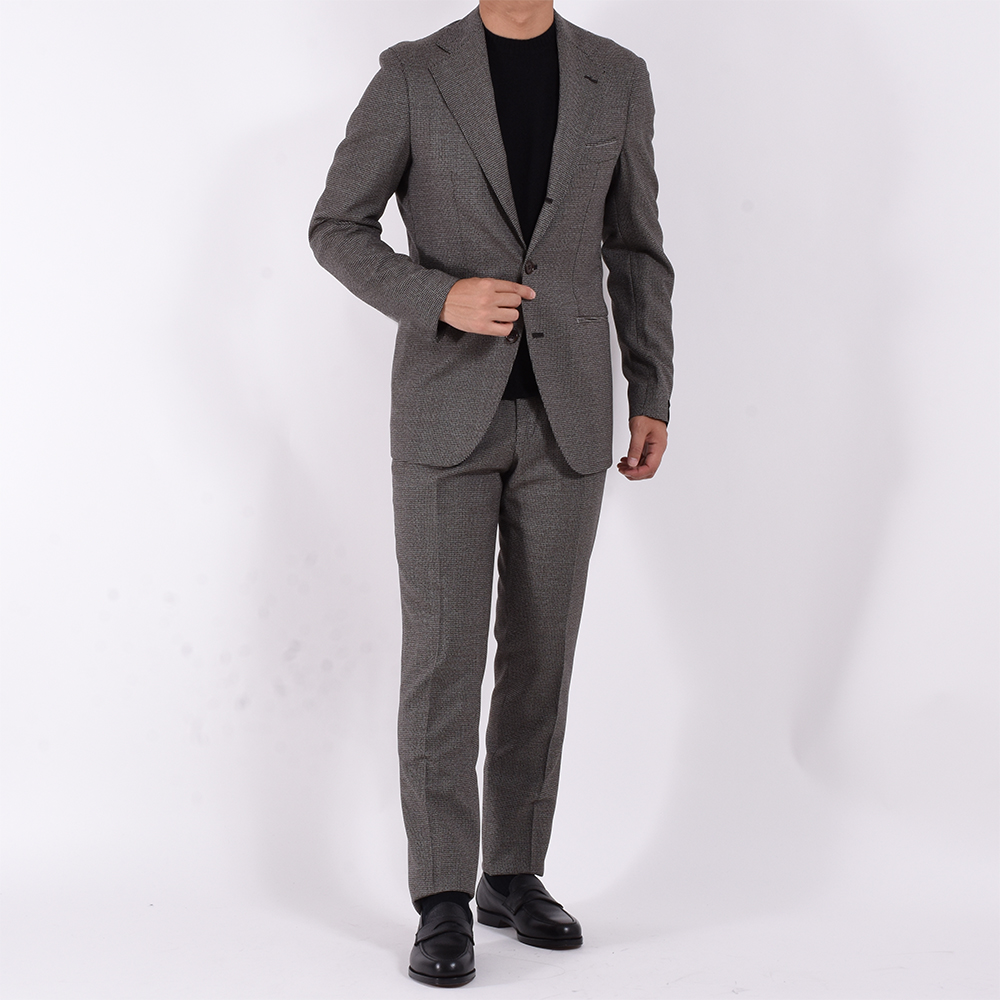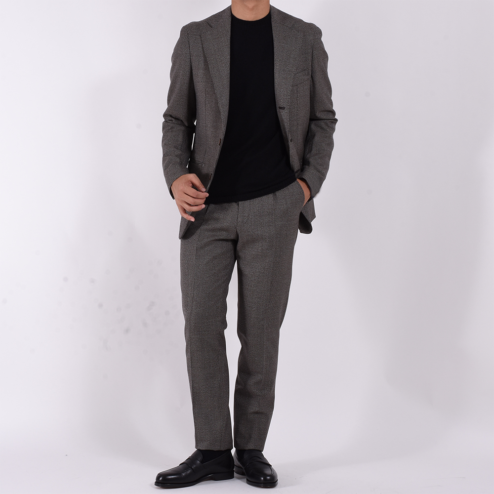 • ジャケット: 総裏仕立て、袖口アンフィニッシュ(4つボタン)、胸バルカポケット、フラップ無し両玉縁ポケット、内側ポケット2つ、サイドベンツ パンツ:1プリーツ、フロントジップ、裾アンフィニッシュ