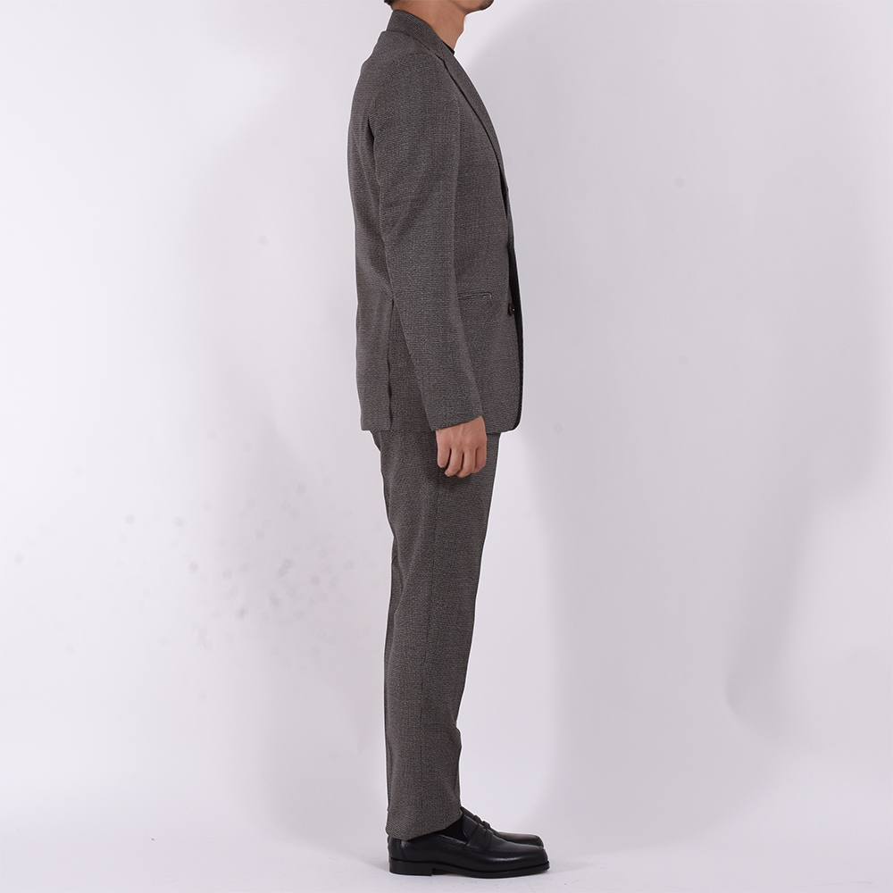 グレーとブラックが混ざり合った生地感は今期非常にお勧めです。タイドアップならば白シャツにウールのブラックのタイを。ドレスダウンならブラックのニットを合わしたスタイルが間違いないでしょう。生地の肌触りはハリがあり、しっかりしているのが特徴的です。細身体型でサイズ46を着用。肩、アームのフィッティングはジャストフィットで、ウエストのみ少しお直しが必要かなと思いました。パンツはウエストとワタリを少し詰める必要がありました。