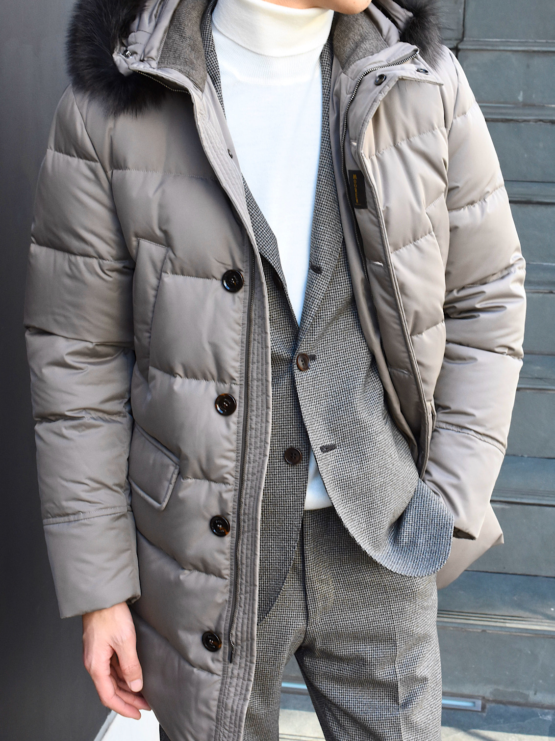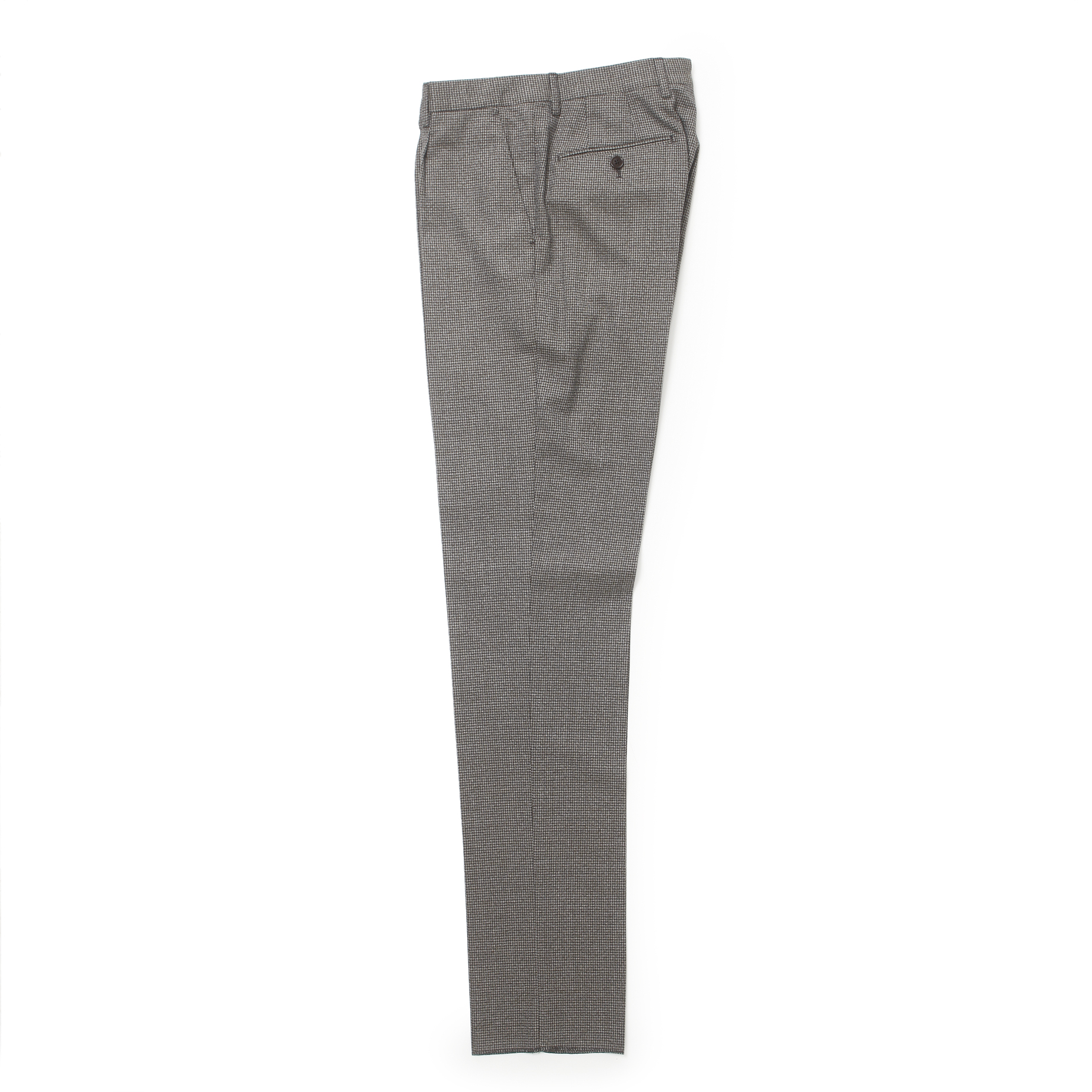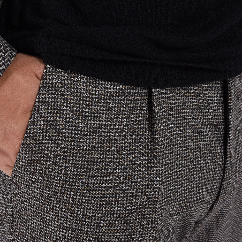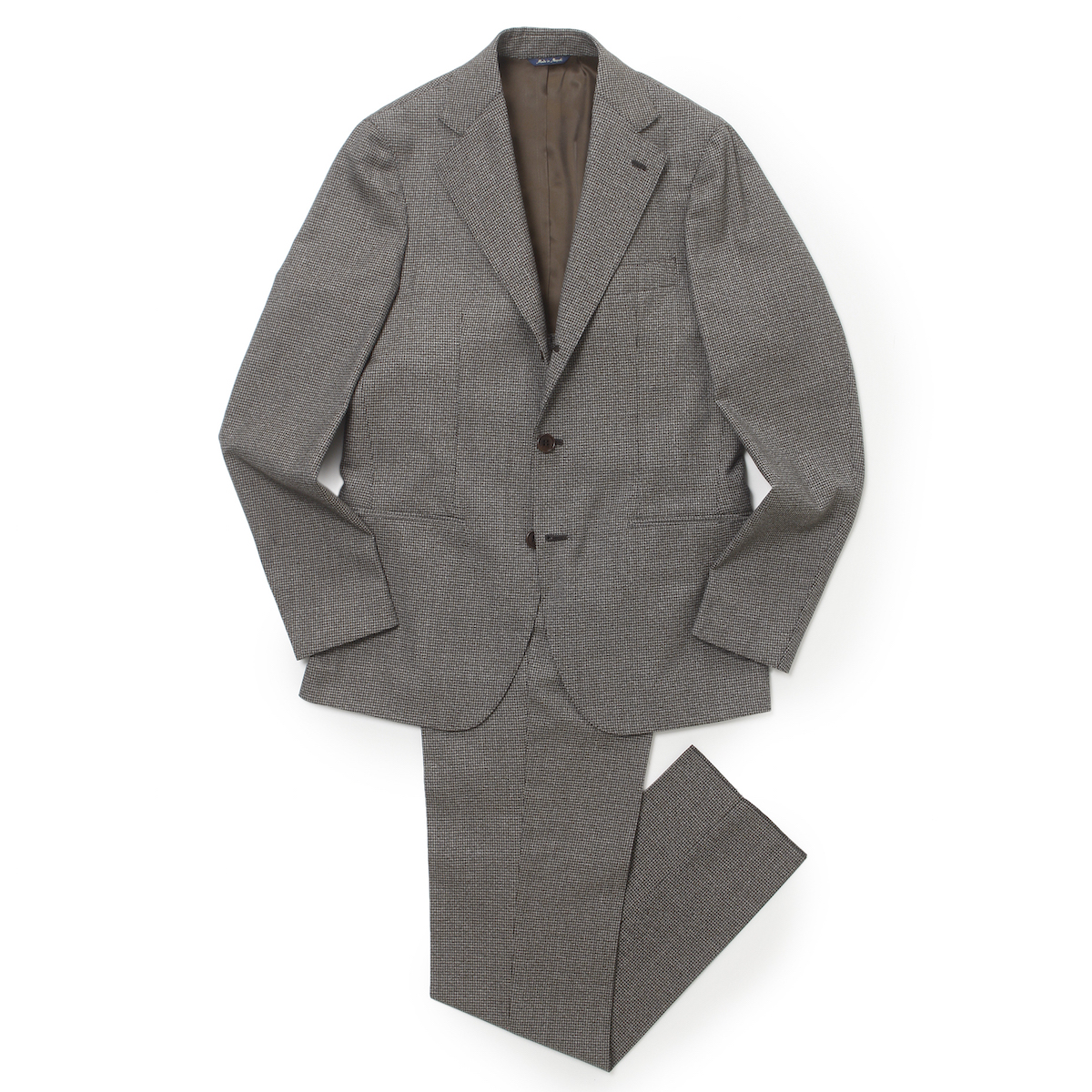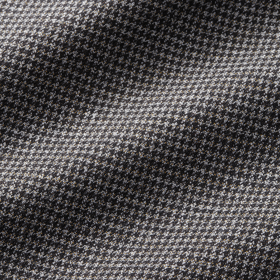 ・生地は千鳥格子のように見えるミニチェック。クリーム、ベージュ、ブラウン系といった色糸を組み合わせグレーにもブラウンにも見える絶妙な柄行きです。