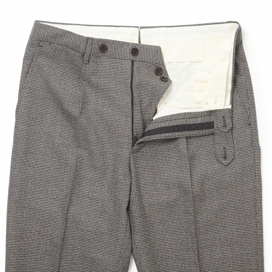 ・パンツは1プリーツのテーパードシルエット。パンチェリーナ仕様なので安心感ある穿き心地とタイト過ぎないあんばいでワタリからスソまでテーパードの効いたラインが特徴的。なだらかな美しいシルエットを描きます。