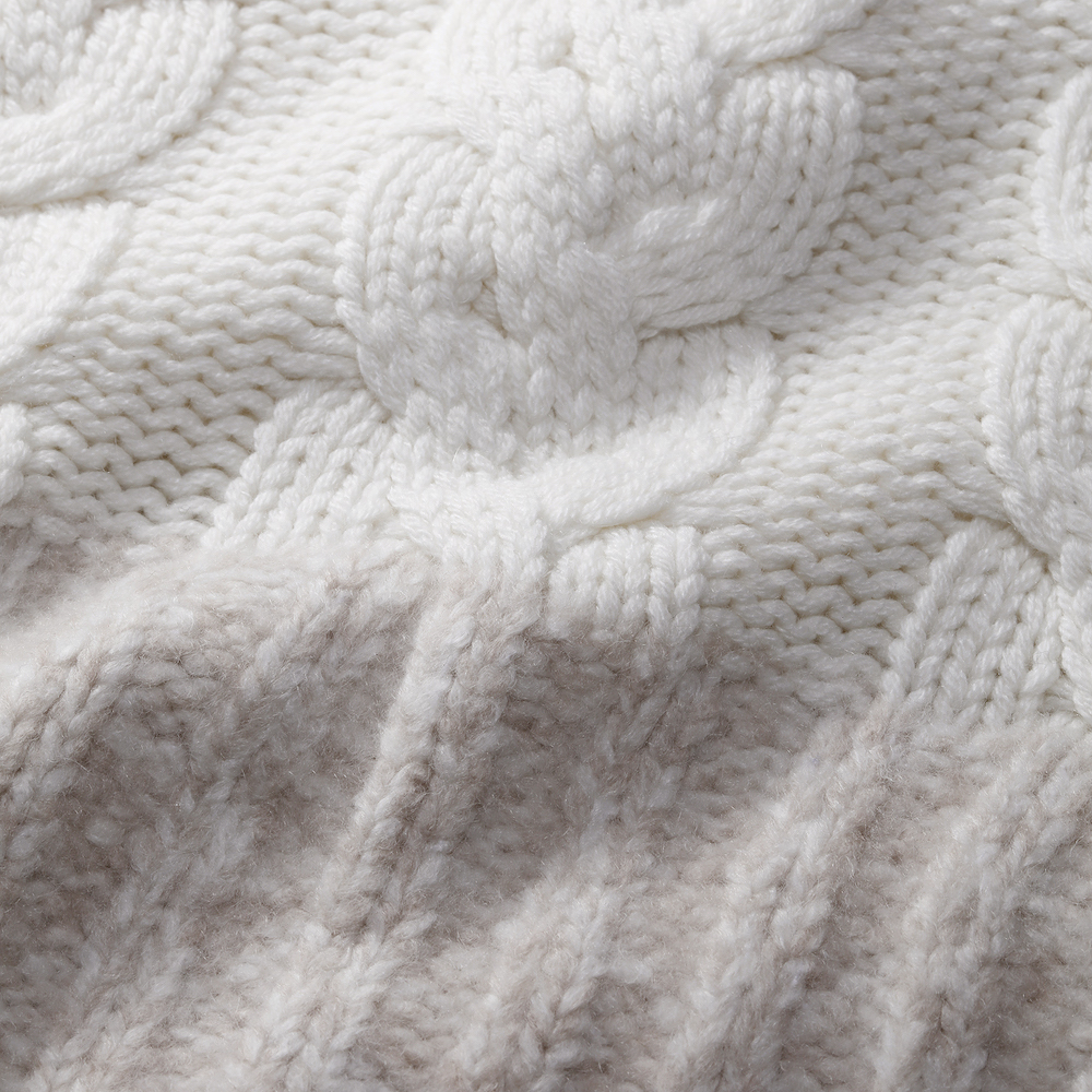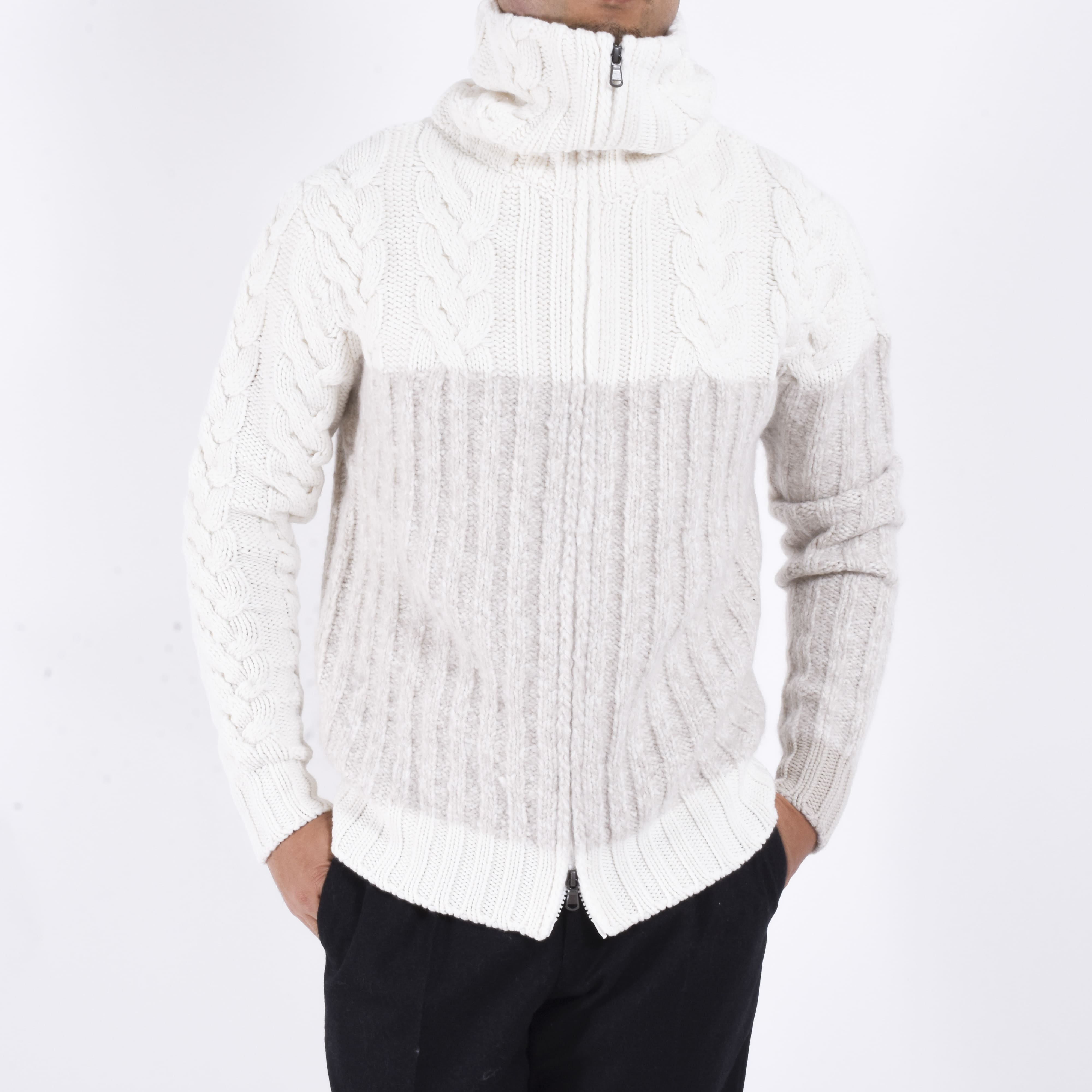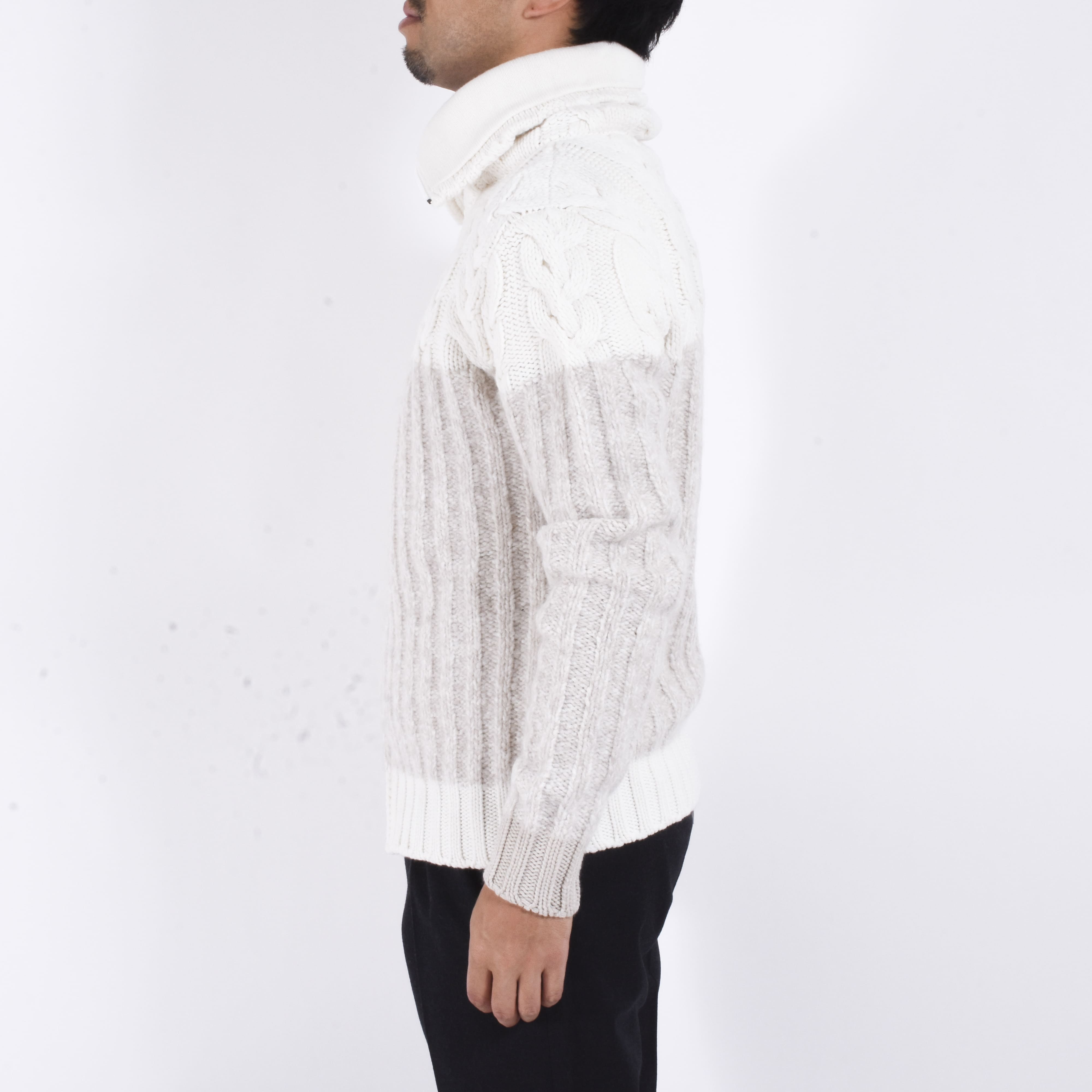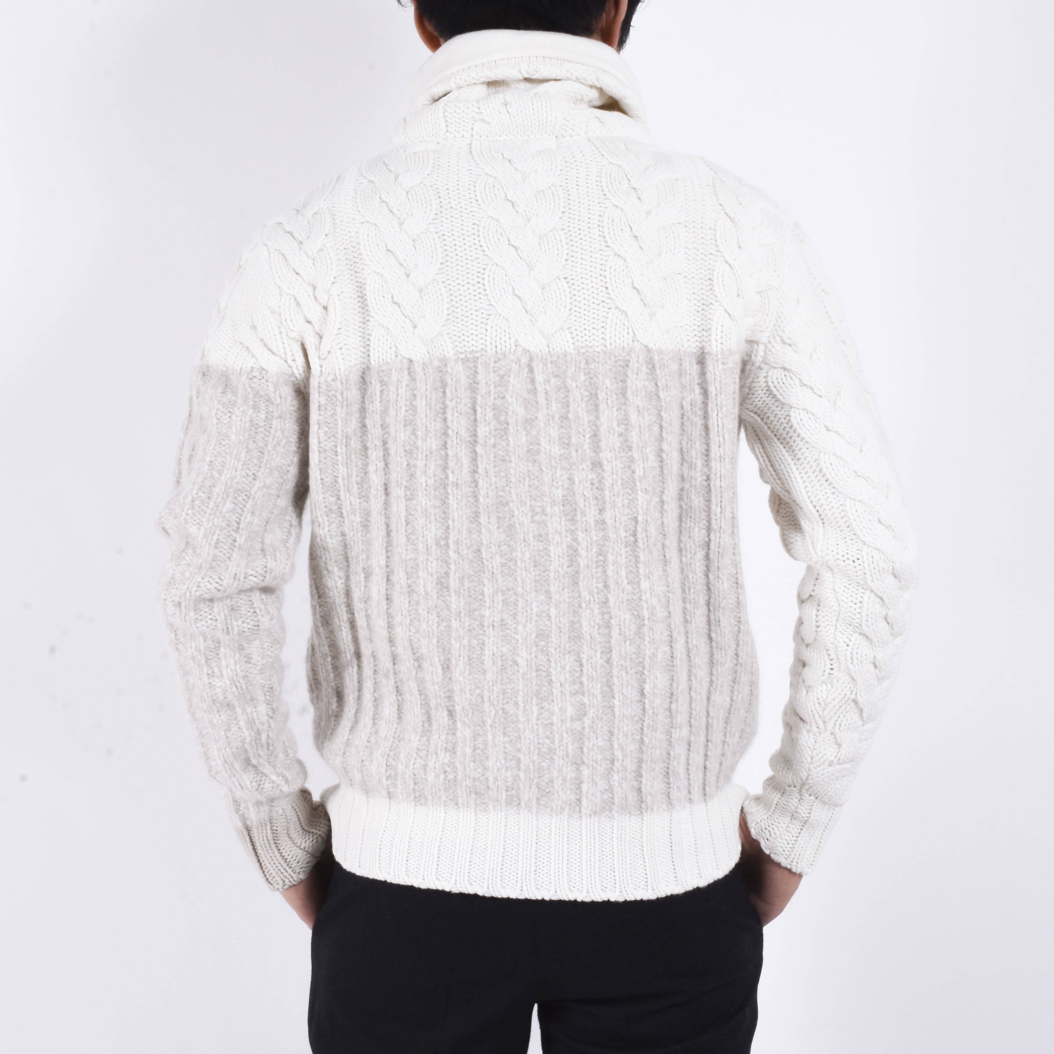 ケーブル編みの柔らかさが印象的でありつつ、ジップアップなのでブルゾン感覚で着用できて、秋冬時の羽織物をお探しの方には是非お勧めしたい一着です。ジップを上まで閉め、首回りをたるませながら羽織るといったこなれた着方もカッコいいでしょう。こちらを羽織る際はTシャツの上から着用し、カシミアの柔らかさを是非楽しんでいただきたいです。