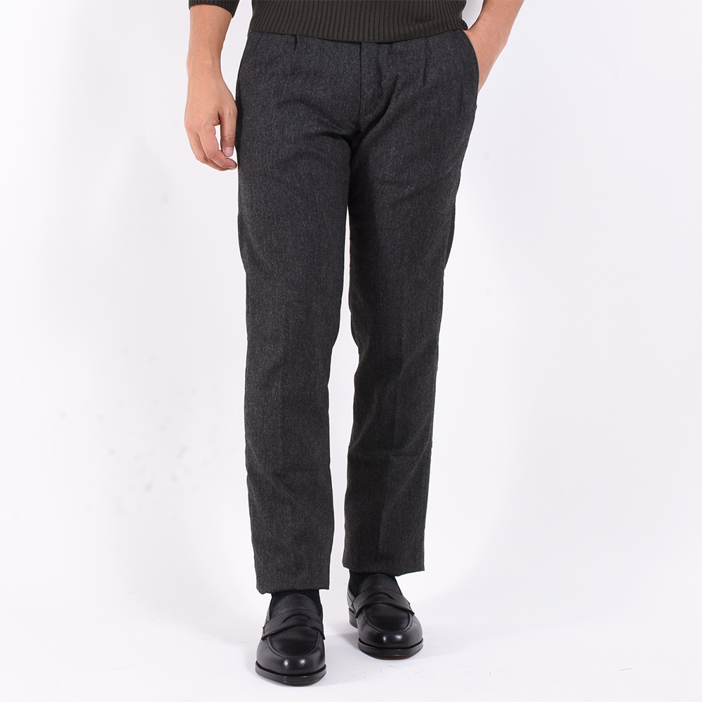 細身なシルエットですが、ツープリーツで腰回りにゆとりを確保している為非常にラクに着用ができ、尚且つシルエットはシャープに見せてくれます。生地はストレッチが効いたウール混なので、ソフトな肌触りが◎そして、カジュアル使いはもちろん、ジャケパンでの着用もできるのは良い点。細身体型でサイズ29を着用しぴったりでした。普段選ばれているサイズでよろしいかなと。