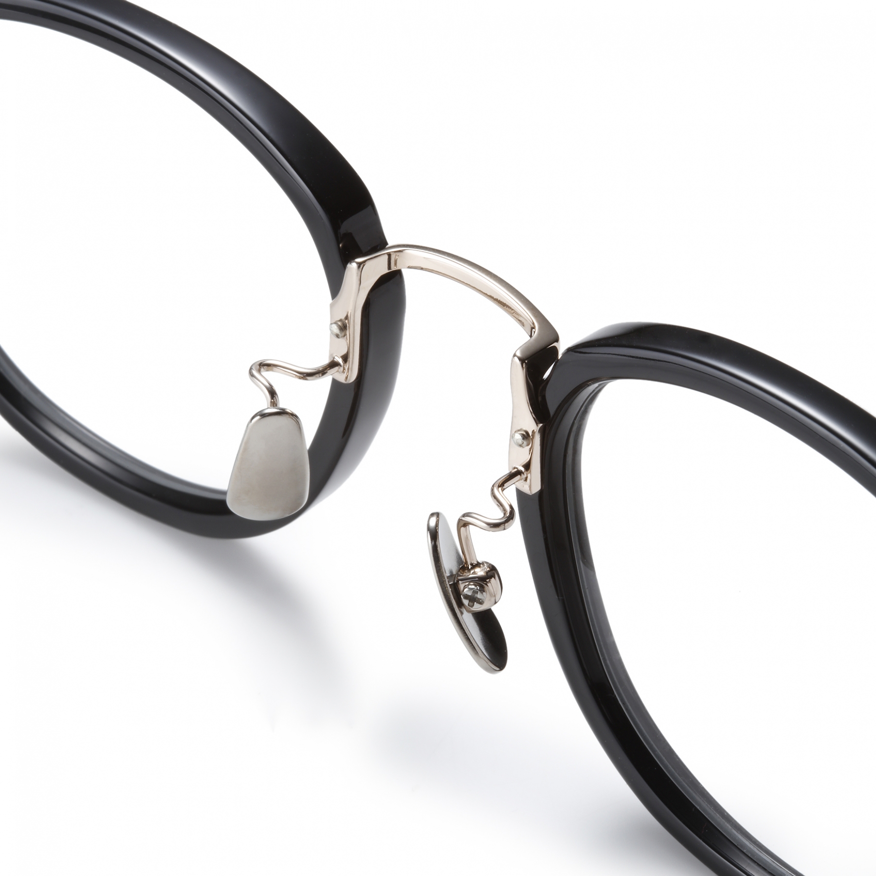 ・とてもシンプルなデザインに見えますが、フレームの厚みやテンプルの形状など全体のバランスが素晴らしく、足し引きの加減を計算し尽くしたデザイン。ブリッジのシルバーパーツがアクセントになっています。