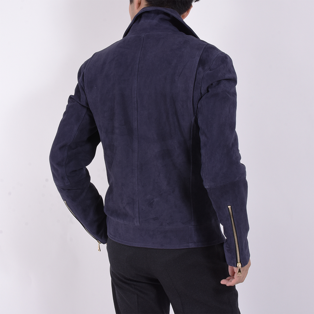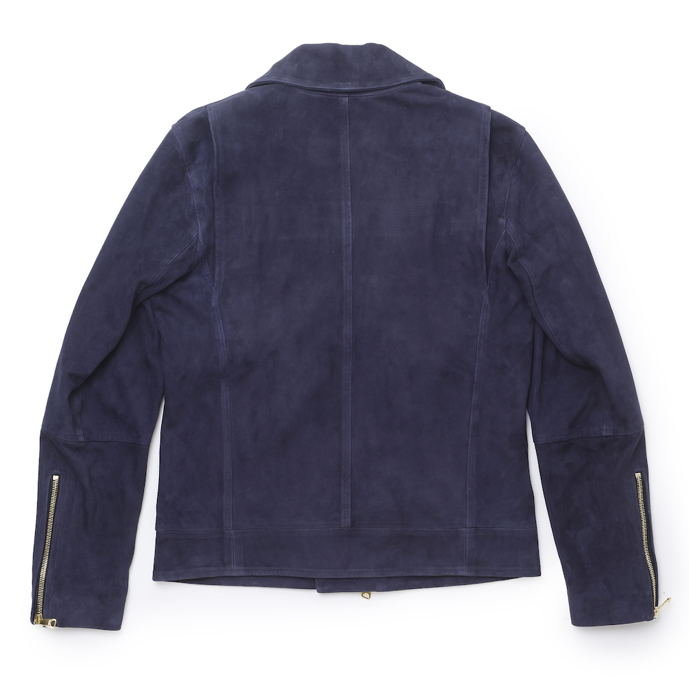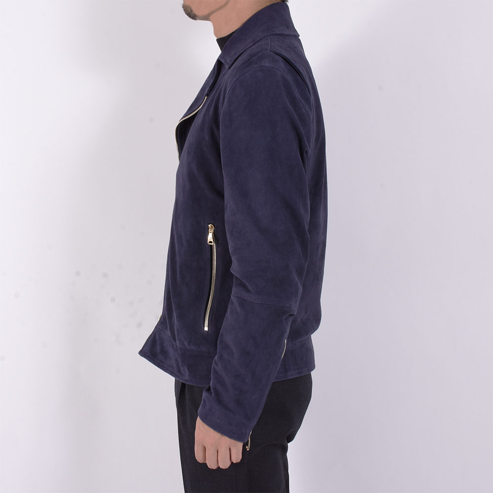 一見、普通のダブルのライダーズジャケットに見えがちですが、ハード過ぎない仕上がりになっており、シングルのライダーズジャケットの感覚で着用が可能。尚且つスウェードレザーを使用している為、柔らかな印象が◎そして、なんと言っても金具はゴールドパーツなのでラグジュアリー感は半端じゃないです。デニムなどを合わせ、カジュアルなスタイリングの場合でしたらネイビーは非常に使えるでしょう。細身体型でサイズ46を着用しぴったりでした。普段選ばれているサイズでよろしいかなと。