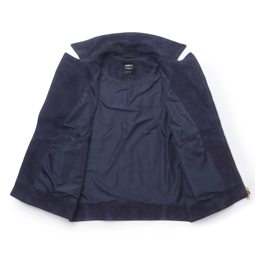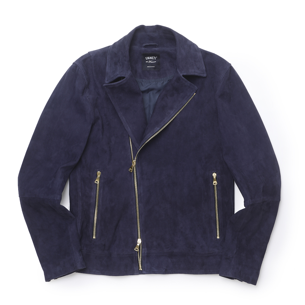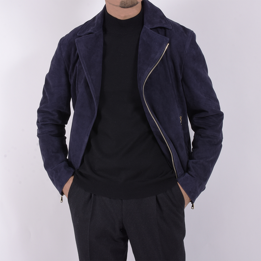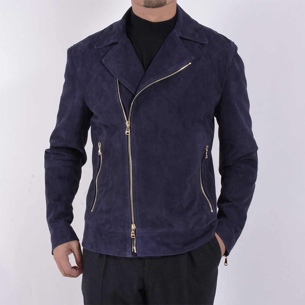 一見、普通のダブルのライダーズジャケットに見えがちですが、ハード過ぎない仕上がりになっており、シングルのライダーズジャケットの感覚で着用が可能。尚且つスウェードレザーを使用している為、柔らかな印象が◎そして、なんと言っても金具はゴールドパーツなのでラグジュアリー感は半端じゃないです。デニムなどを合わせ、カジュアルなスタイリングの場合でしたらネイビーは非常に使えるでしょう。細身体型でサイズ46を着用しぴったりでした。普段選ばれているサイズでよろしいかなと。