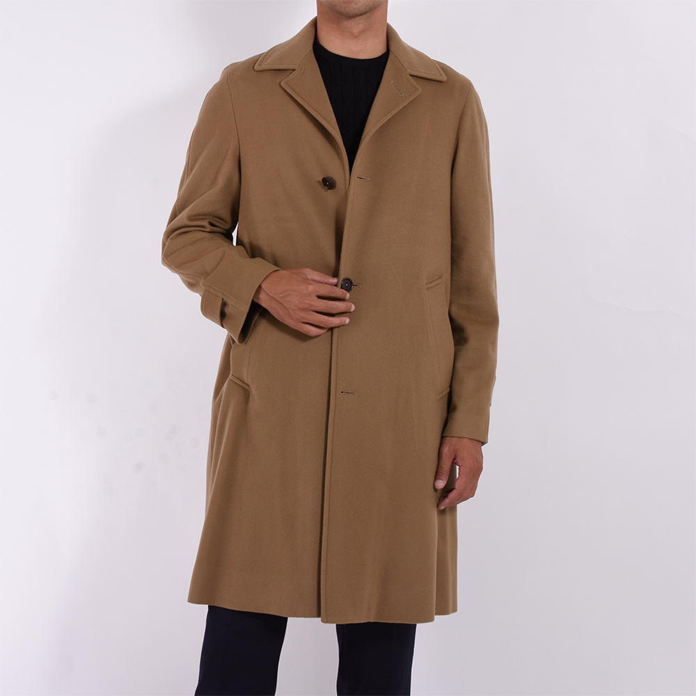 ベルテッドコートは個人的に大好きなアイテムであり、実際試着した時「さすが…」と感じました。ベルトを男らしく結んだシルエット、ベルトを締めずにポケットに入れたこなれた着こなし、上品な風合いのカシミア混はやはり格別。スーツスタイルからカジュアルスタイルまで使えるこちらのコートを是非男らしく、そして上品に着こなしてみてはいかがでしょうか。襟を立てたスタイルはしっかり首元が隠れ、着丈は膝上5cm程の長さでした。細身体型でジャケットの上からサイズ46を着用しぴったりでしたので、普段選ばれているサイズでよろしいかなと。