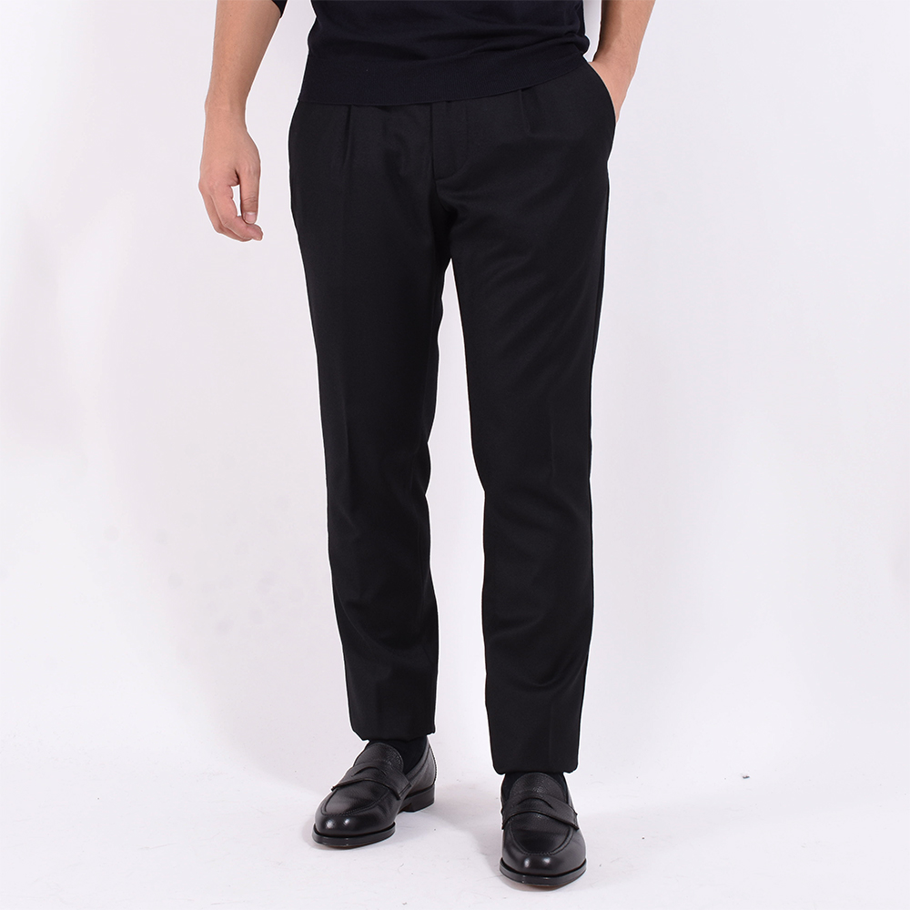 遂に登場??ベーシックなワンプリーツで腰回りに少しゆとりがあるものの、テーパードが効き非常に綺麗なシルエットに仕上がっています。カシミア混の生地感なのでほんのりと光沢があり、ベーシックなのに上品に見せてくれる一本はジャブスゴールドならでは。革靴はもちろんですがスニーカーでのカジュアルスタイルにも合わせて頂きたいです。細身体型でサイズ42を着用しぴったりでした。普段選ばれているサイズでよろしいかなと。