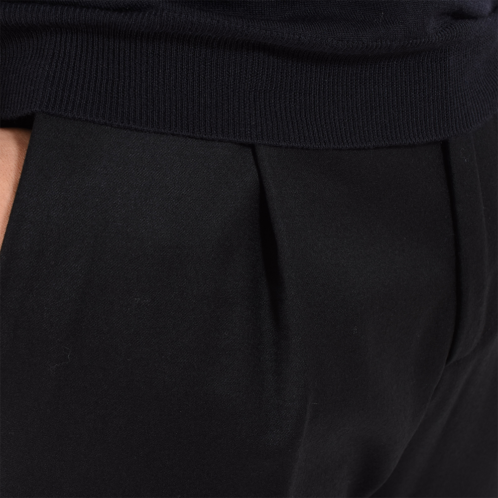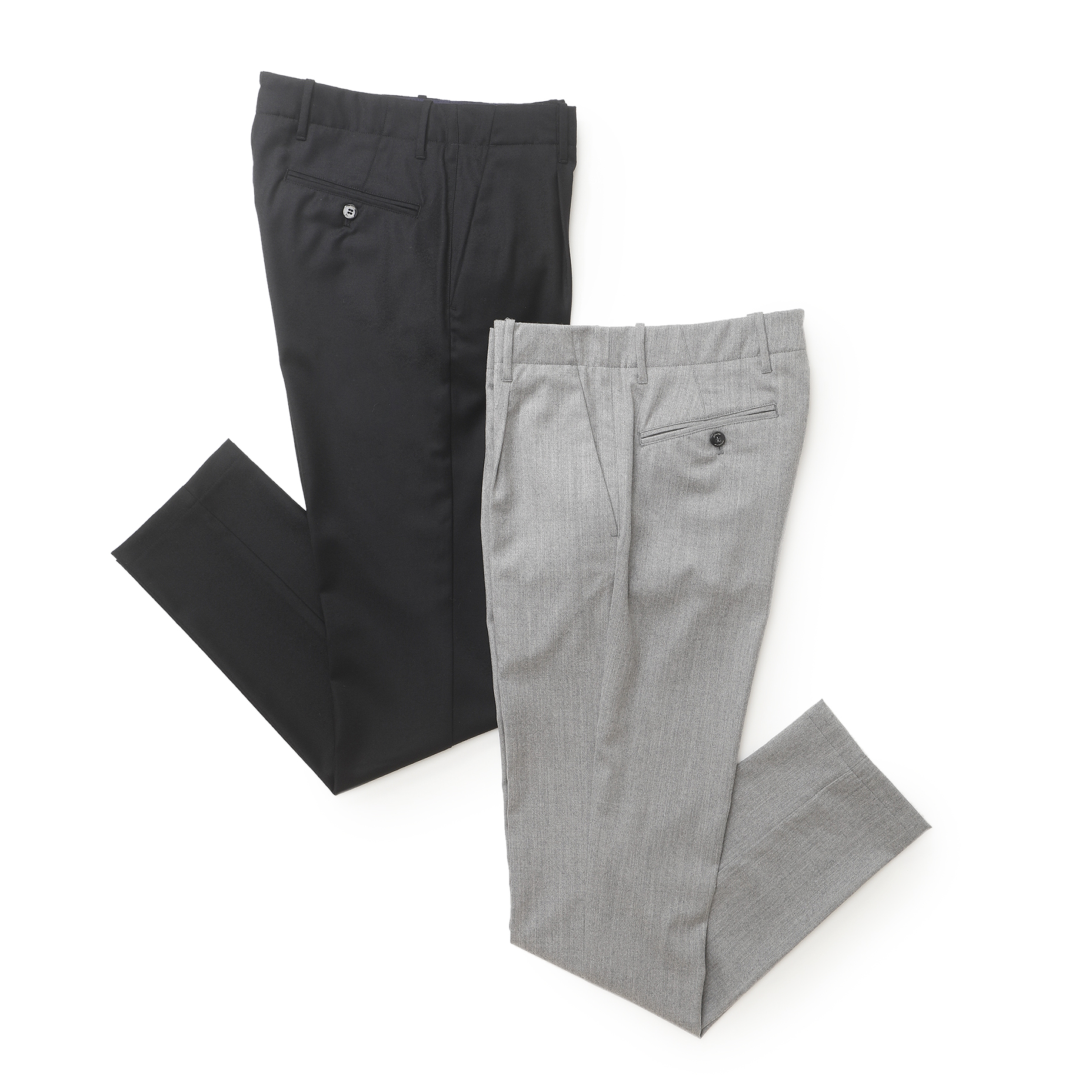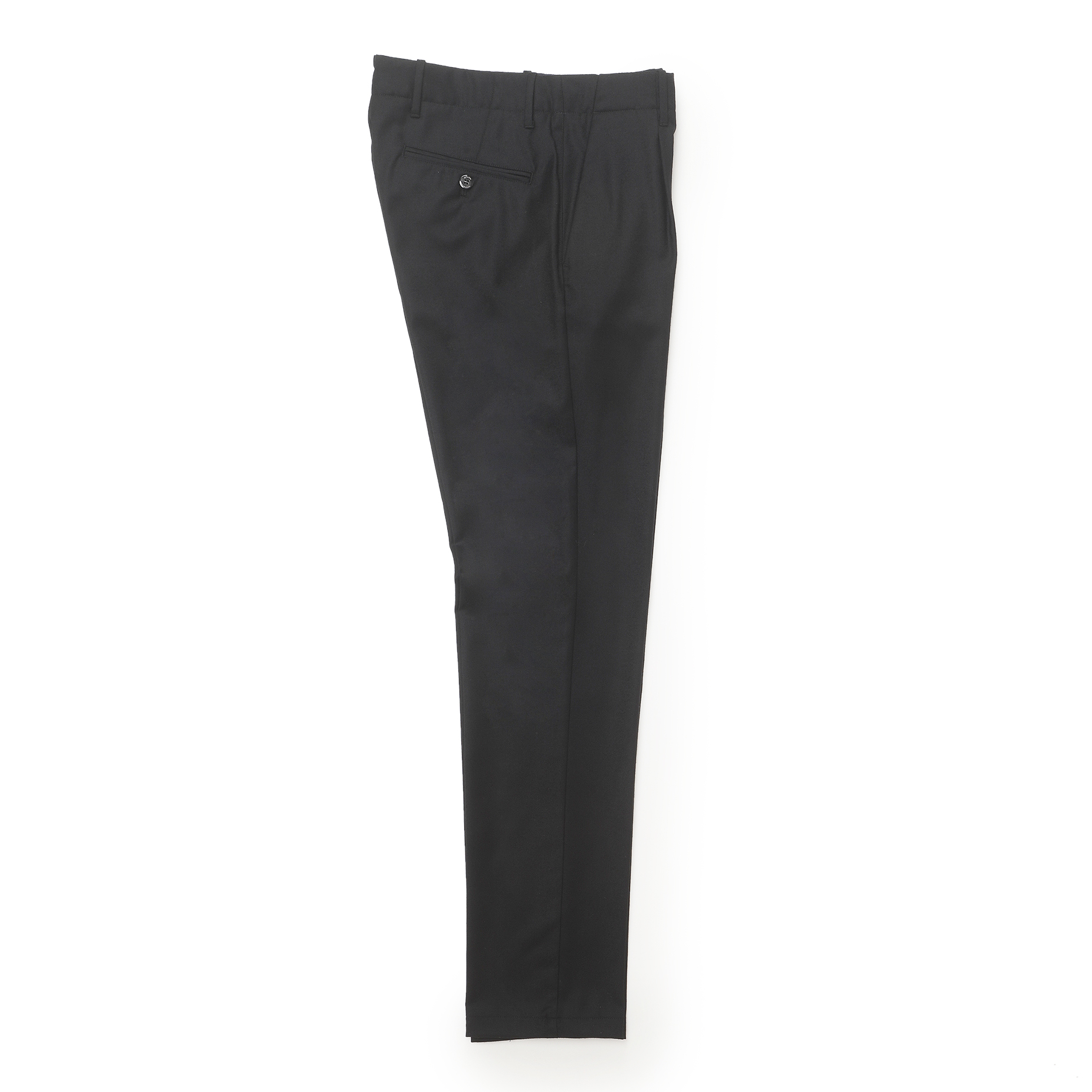 ・プリーツが入っていることで絶妙な加減でゆとりある腰廻りになっており、膝から裾にかけてはテーパードをかけたシャープなシルエット。テーパードをかける位置を高めに設定することで、膝から下がほっそり見えるのが特徴。ロールアップして短めの丈で穿いても膝下が長く、スッキリと見えます。