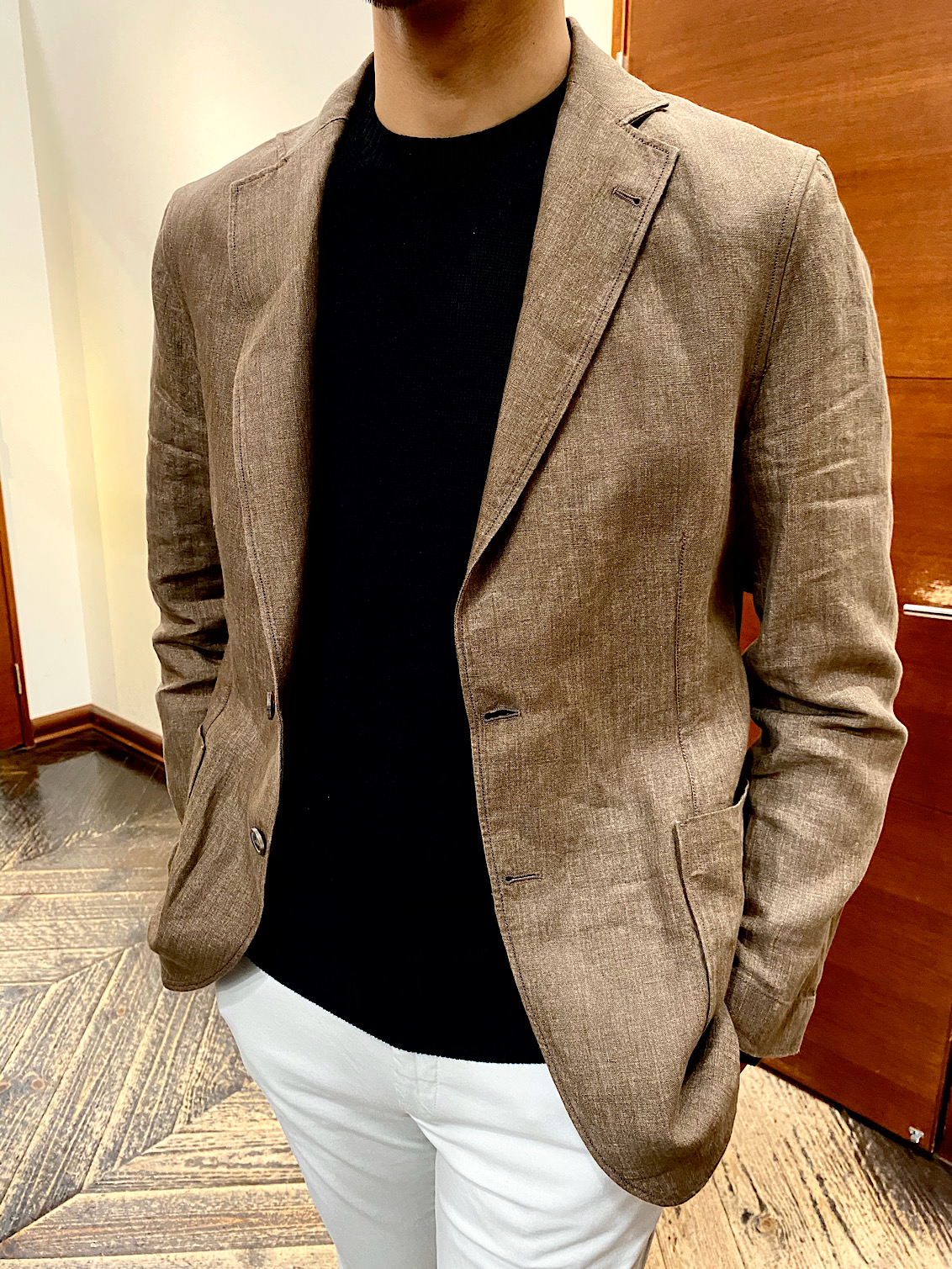 入荷した時から気になっていたこちらのコットンニット。コットンなのに柔らかく滑らかな肌触りの生地感はさすがフェデリ。ニットで気になる点と言えば、ネック部分や袖のリブの詰まり加減、そしてシルエット。リブの詰まり加減は非常にしっかりとしていて、個人的に合格◎シルエットも細身体型でサイズ46を着用し8Gらしい、ほんのりとゆとり感がしっかりあり合格◎結果、100点満点の仕上がりのサイズ感なので言う事無しでした!カジュアルスタイルはもちろん、ジャケットのインナーとしても使えるので是非ワードローブに追加してみては!普段選ばれているサイズをお選びくださいませ。