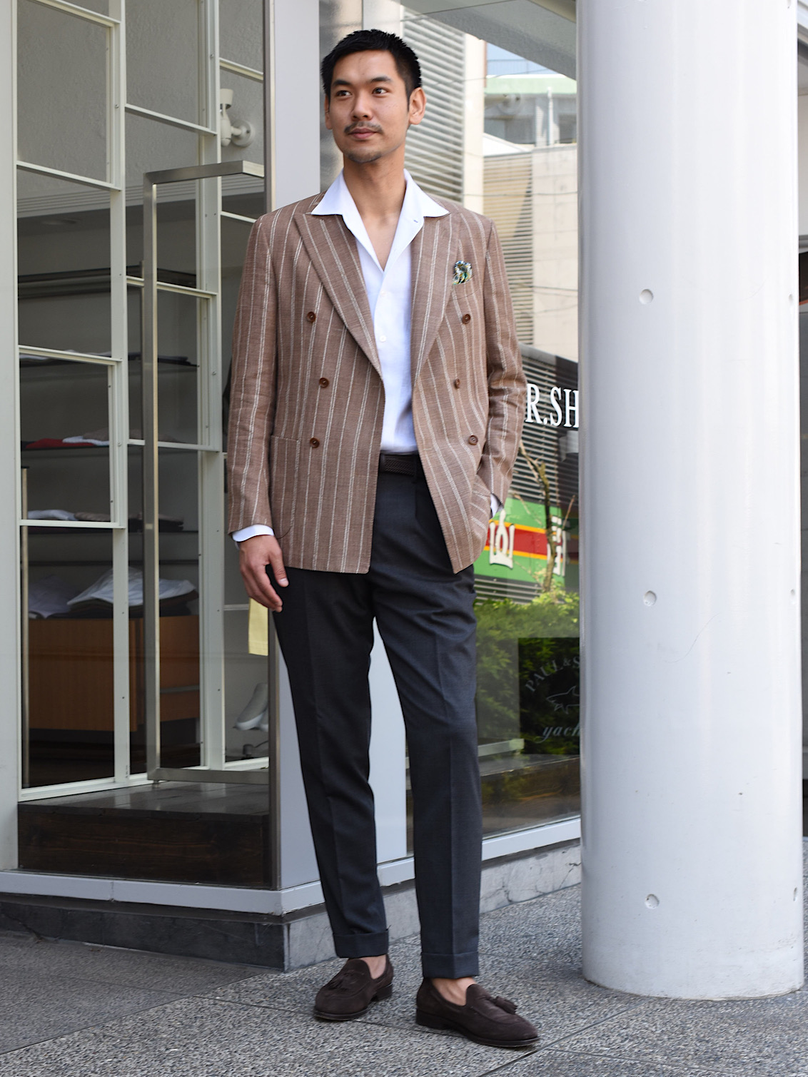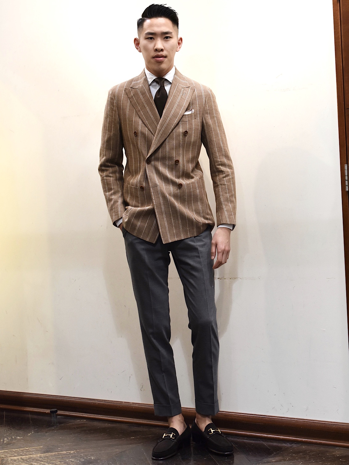 ・ジャケットのモデルはハーフキャンバス仕立て6つボタン2パッチポケットの"VESUVIO"です。ややワイドでほのかに丸みあるグラマラスなラペルが特徴。生地を多く使うという意味でダブルブレステッドはラグジュアリーな雰囲気を醸します。