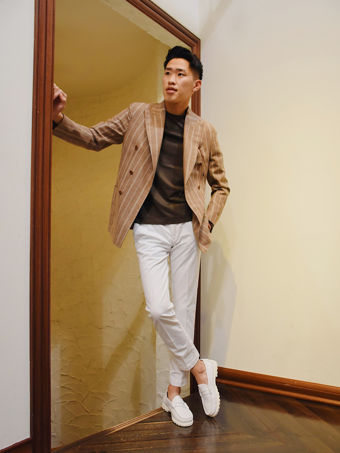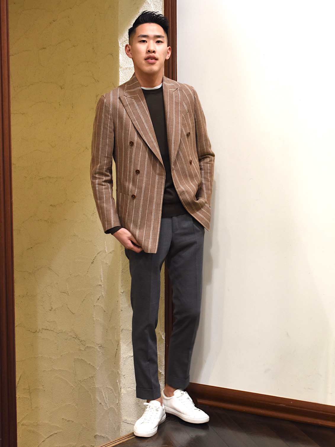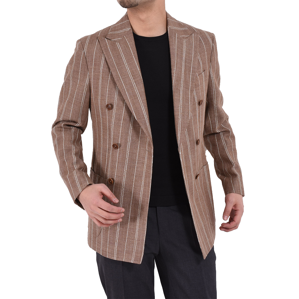 今季BRではお勧めの配色である、ライトブラウンに白ストライプ柄のジャケット。春夏らしい色味でありながら、上品な要素もしっかりキープ。生地はシルク、リネン、ナイロンの三織混。通気性があり少しざっくりとした生地感ではありますが、とてもしっかりした質感になっております!