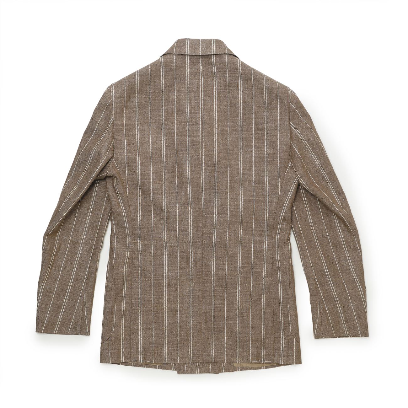 ・決して土臭くならない品のあるブラウン系の色合い、トーンオントーンで入れられたベージュのストライプ、シルクとリネンをベースにした豊かな表情を浮かべる生地感。展示会時に多くのバイヤーに絶賛されたと言われる日本エクスクルーシブの生地を採用した一着です。