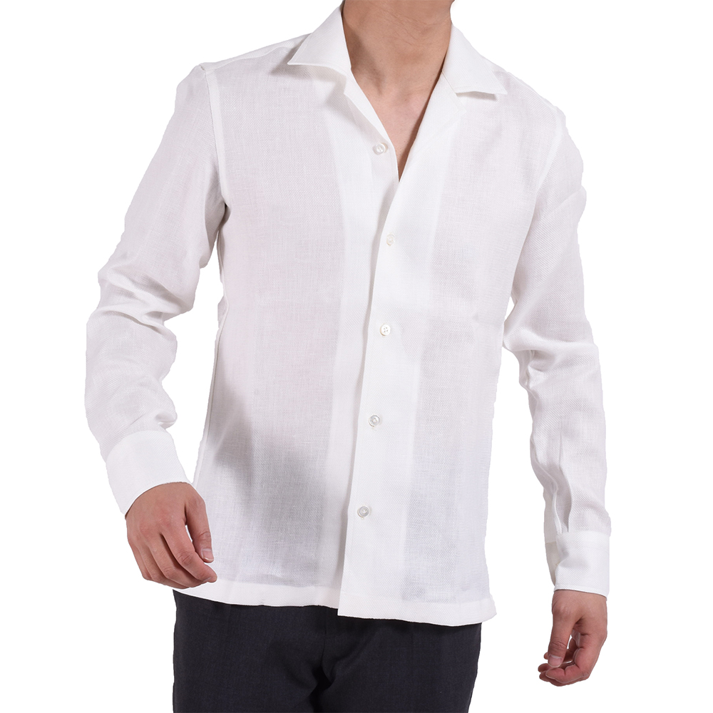 ・生地はリネン100%のバスケット織り。通気性は確保しながらもしっかり感があるので、一枚で着てもサマになる生地です。