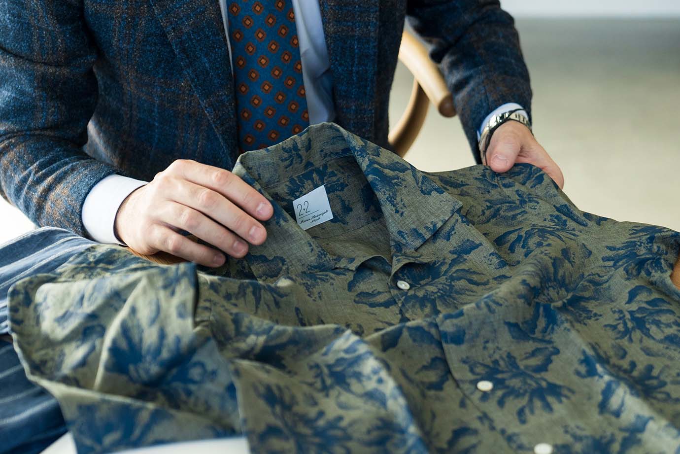 ・イタリアではオープンカラーがミリタリーシャツ(士官服)に由来すると言われていることもあり、カジュアル過ぎず、どことなくきちんと感があるのが「Maria Santangelo(マリア・サンタンジェロ)」らしいところ。