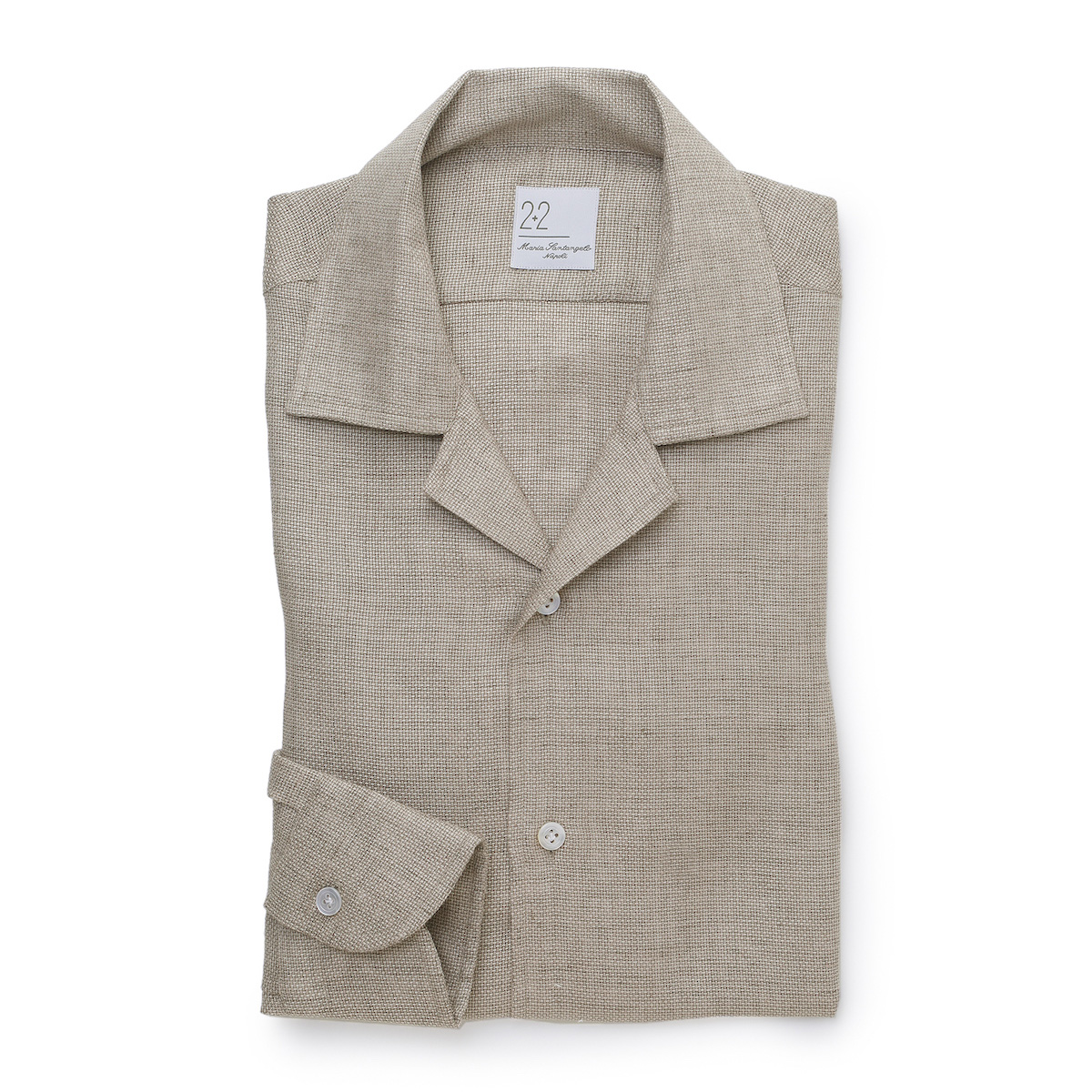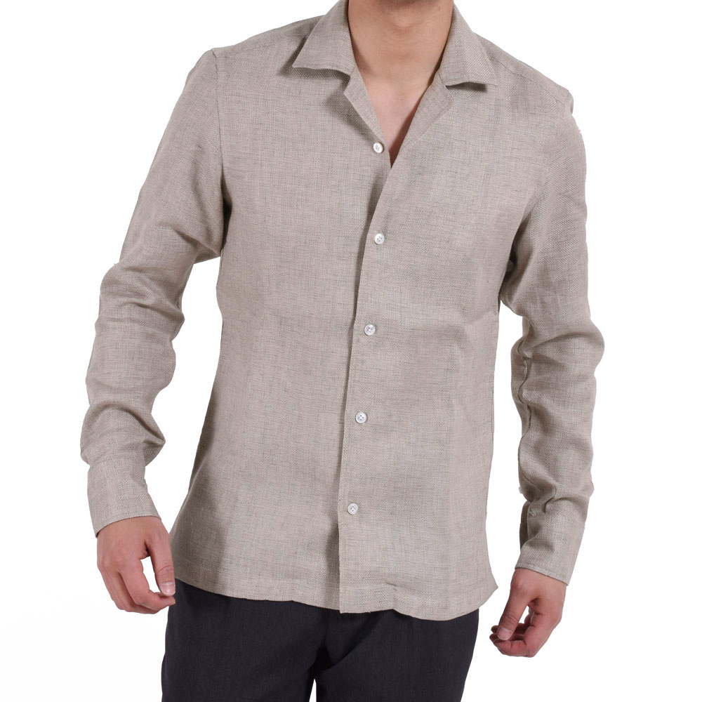 ・生地はリネン100%のバスケット織り。通気性は確保しながらもしっかり感があるので、一枚で着てもサマになる生地です。