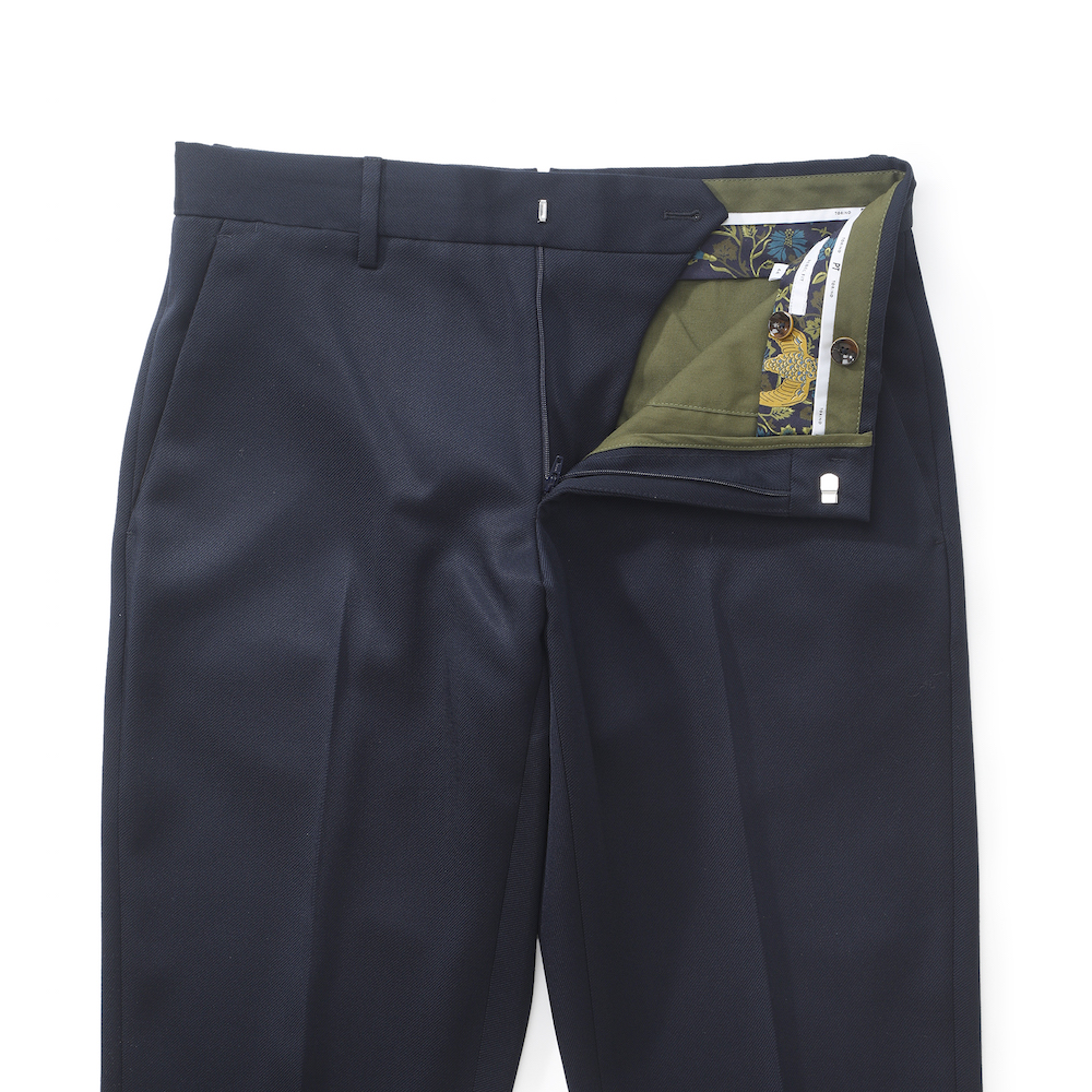 ・しっかりと確保された股上により、安心感ある腰廻りのフィッティングも特徴です。また、裾はアンフィニッシュではなくシングルにて仕上げられているので、(穿く方の股下寸法によっては)お直しナシで穿くことができるのも楽ですね。