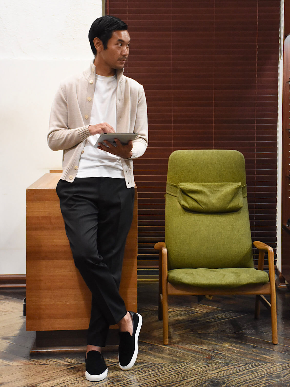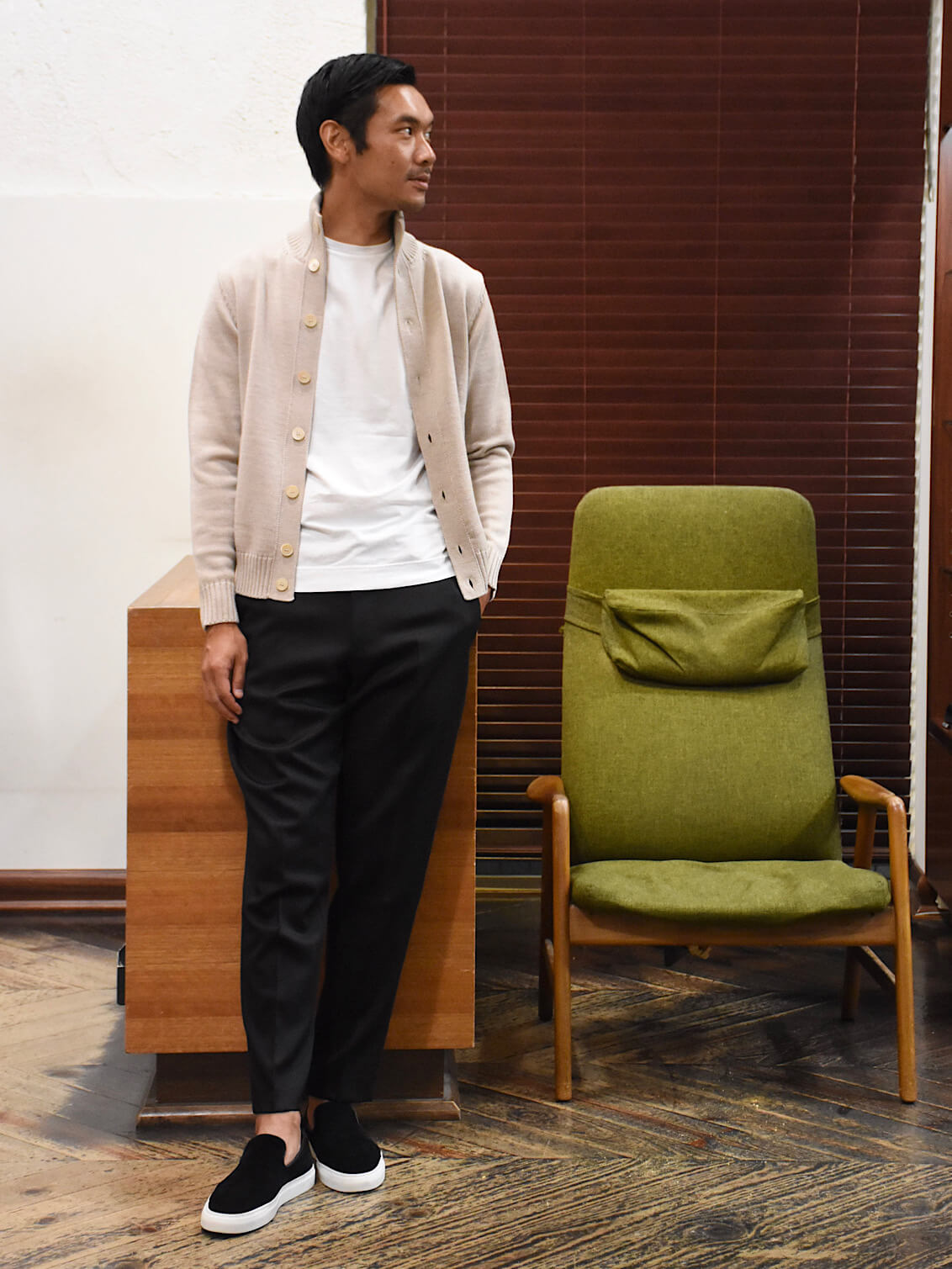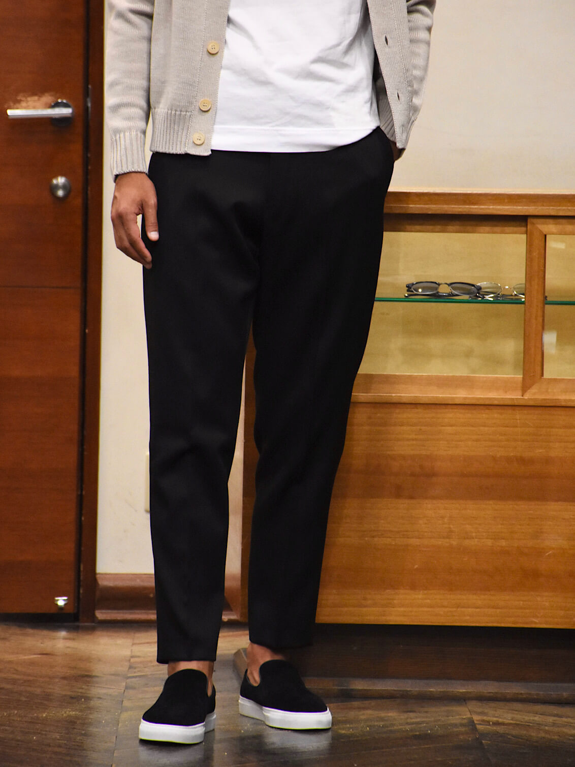 ノープリーツですが、ユルいフィッティングを味わえるこちらのモデル。ユルりとしてますが、ヒップから裾に向かって細くなっているので、綺麗な脚のラインが仕上がります。ユルめのフィッティングでありながら、綺麗なシルエットのパンツがお好きな方には是非お勧めしたい一本です!またツイル生地らしい光沢感は、上品な印象を醸します。細身体型でサイズ42を着用しジャストサイズでした。レングスは少し短めなので、足元はスッキリした印象に見えます。シャープなフォルムのシューズを合わせるのが個人的にはお勧めです!